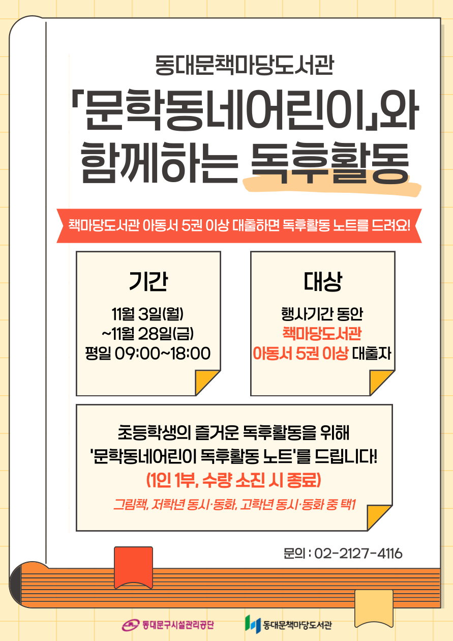 |  '문학동네어린이'와 함께하는 독후활동📚 행사기간(11/3~11/28) 동안 책마당도서관 아동서 5권 이상 대출하면 문학동네어린이 독후활동 노트를 드립니다! ✅기간 : 11/3(월)~11/28(금) 평일 오전 9시~오후 6시 ✅대상 : 행사기간 동안 책마당도서관 아동서 5권 이상 대출자 ✅내용 : 초등학생의 즐거운 독후활동을 위한 '문학동네어린이 독후활동 노트' 제공(1인 1부 제공, 수량 소진 시 종료) | |