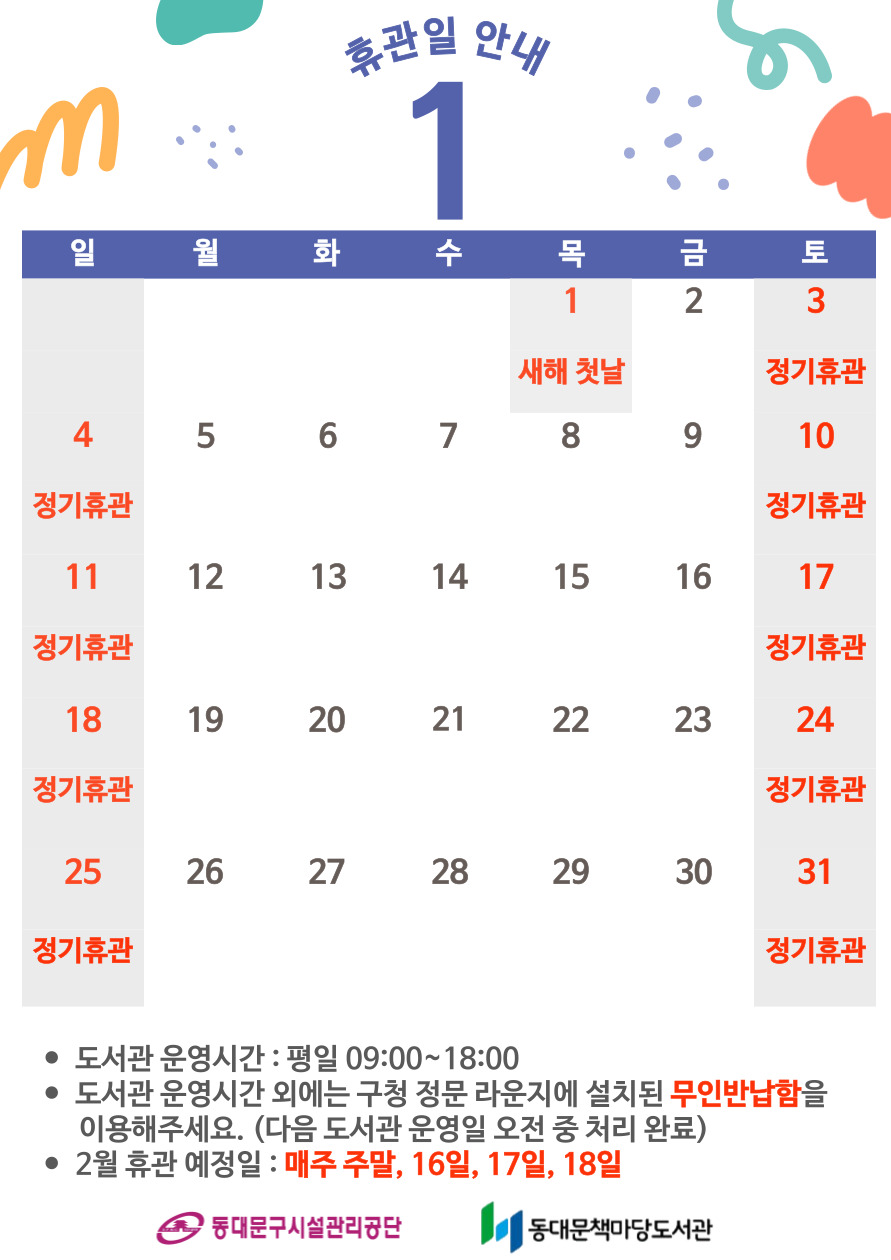 [공지] 2026년 1월 동대문구정보화도서관 휴관일 안내