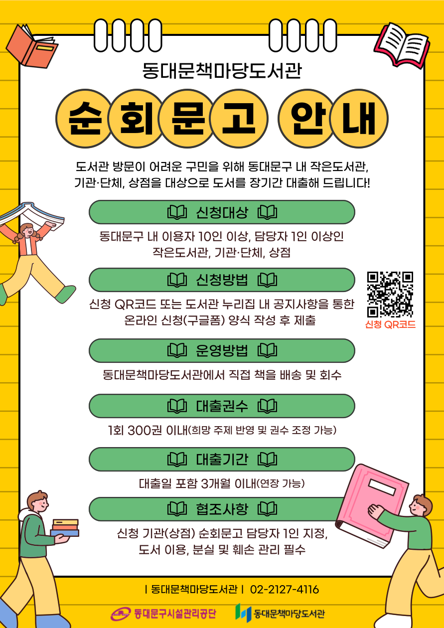 ![]() 📢순회문고란? 도서관 방문이 어려운 구민을 위해 동대문구 내 작은도서관, 기관 및 단체, 상점을 대상으로 도서를 장기간 대출해 주는 서비스입니다. ✅ 신청대상 : 동대문구 내 이용자 10인 이상이고 담당자 1인 이상인 작은도서관, 기관, 단체, 상점 ✅ 운영방법 : 동대문책마당도서관에서 직접 책을 배송 및 회수 ✅ 신청방법 : 온라인 신청(구글폼) 양식 작성 후 제출 ★신청 URL : https://vo.la/lpIXwCX ✅ 대출권수 : 1회 300권 이내(희망 주제 반영 및 권수 조정 가능) ✅ 대출기간 : 대출일 포함 3개월 이내(연장 1회 가능) ✅ 협조사항 : 신청기관(상점) 순회문고 담당자 1인 지정 및 도서 이용, 분실 및 훼손 등 관리 필수 📞 문의사항 : 02-2127-4116 |