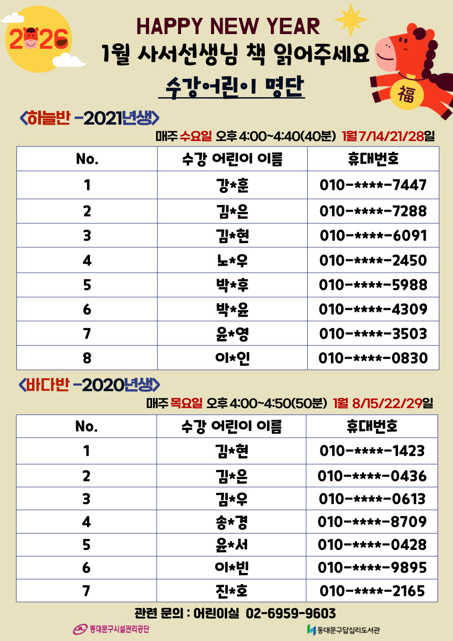 [프로그램] 2026년 1월 사서선생님~ 책 읽어주세요! 수강 어린이 명단 안내