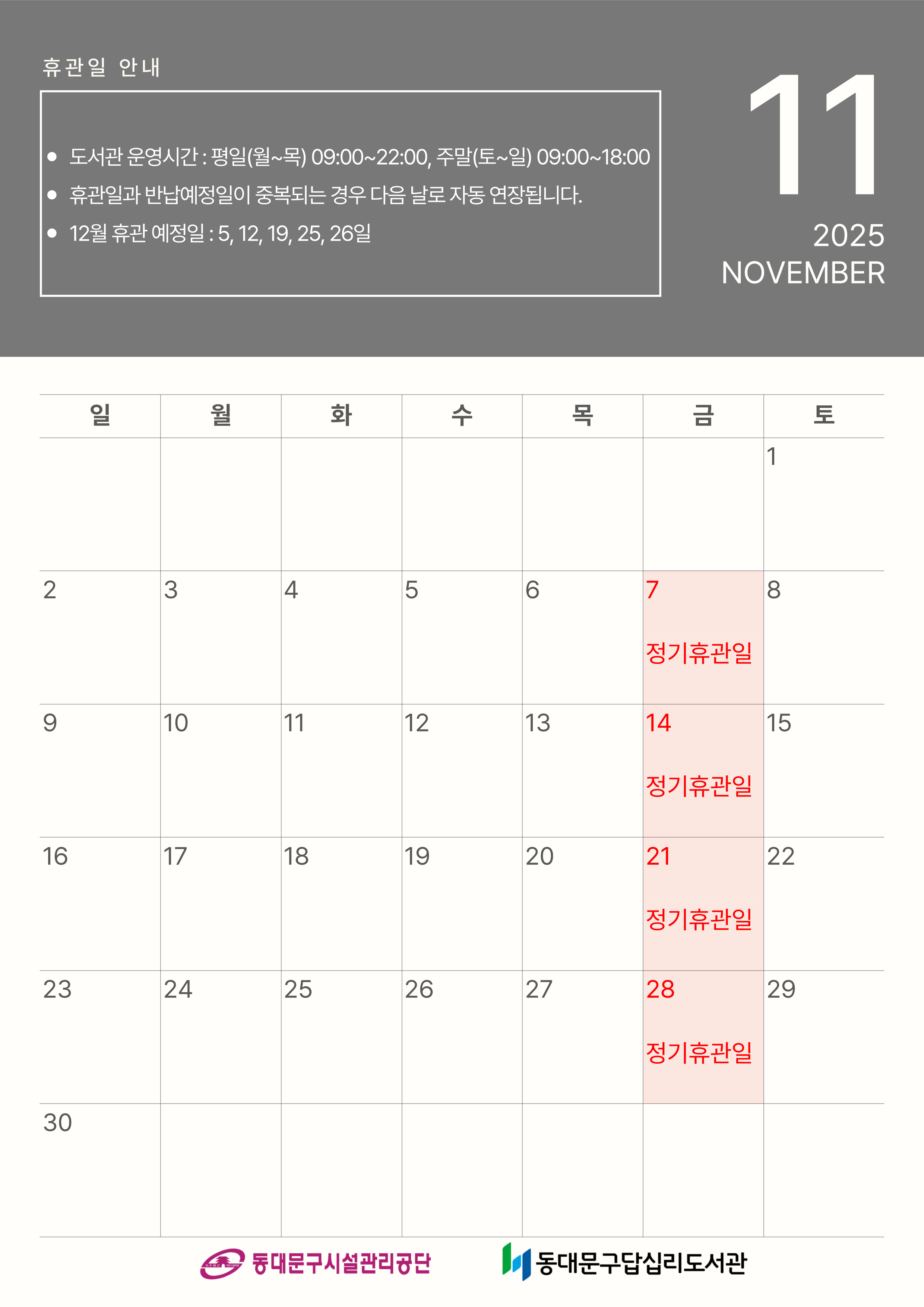 [용두어린이영어도서관] 2025년 11월 휴관일 안내