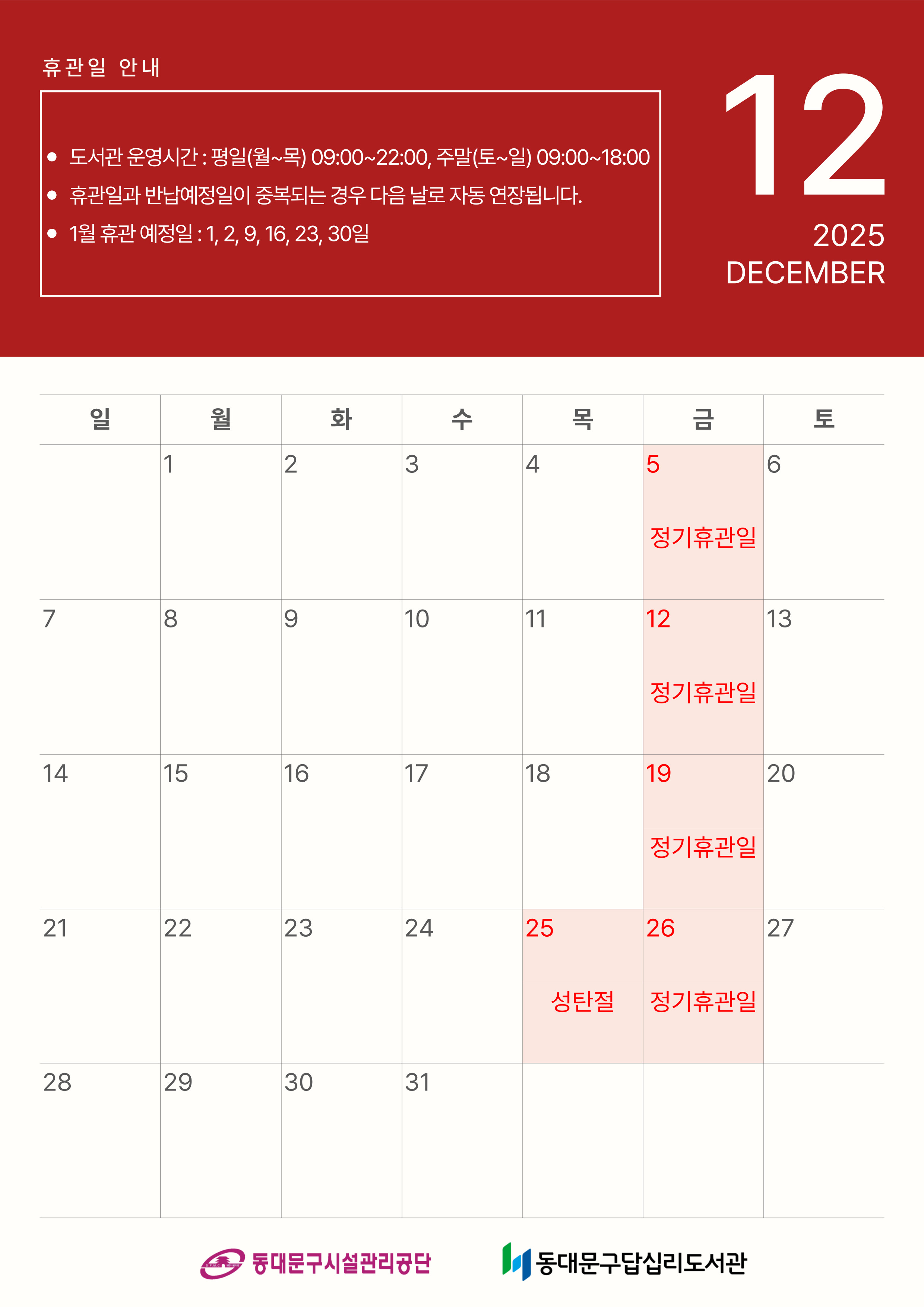 12월 휴관일 안내 [제기동감초마을현진건기념도서관]