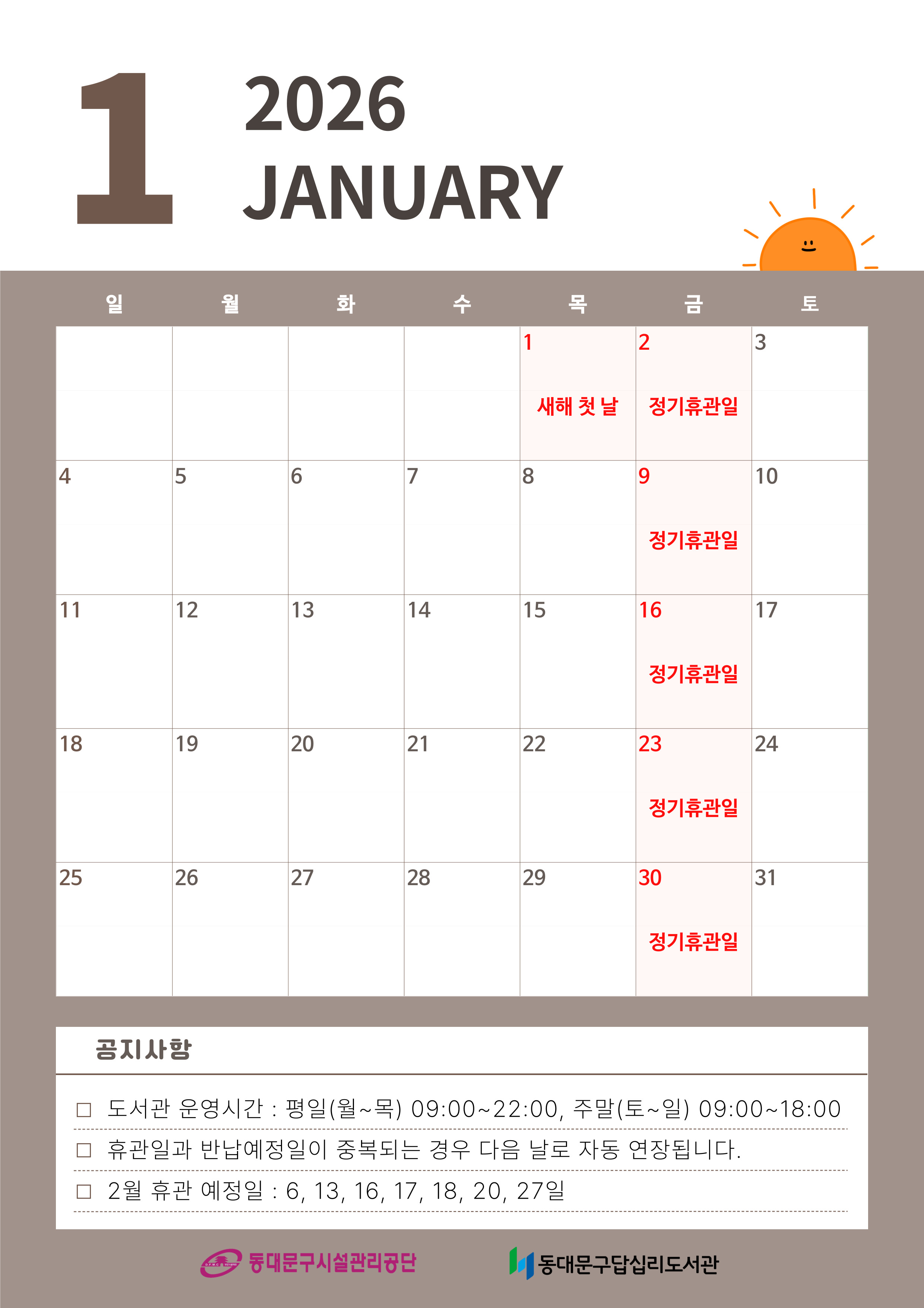 2026년 1월 휴관일 안내