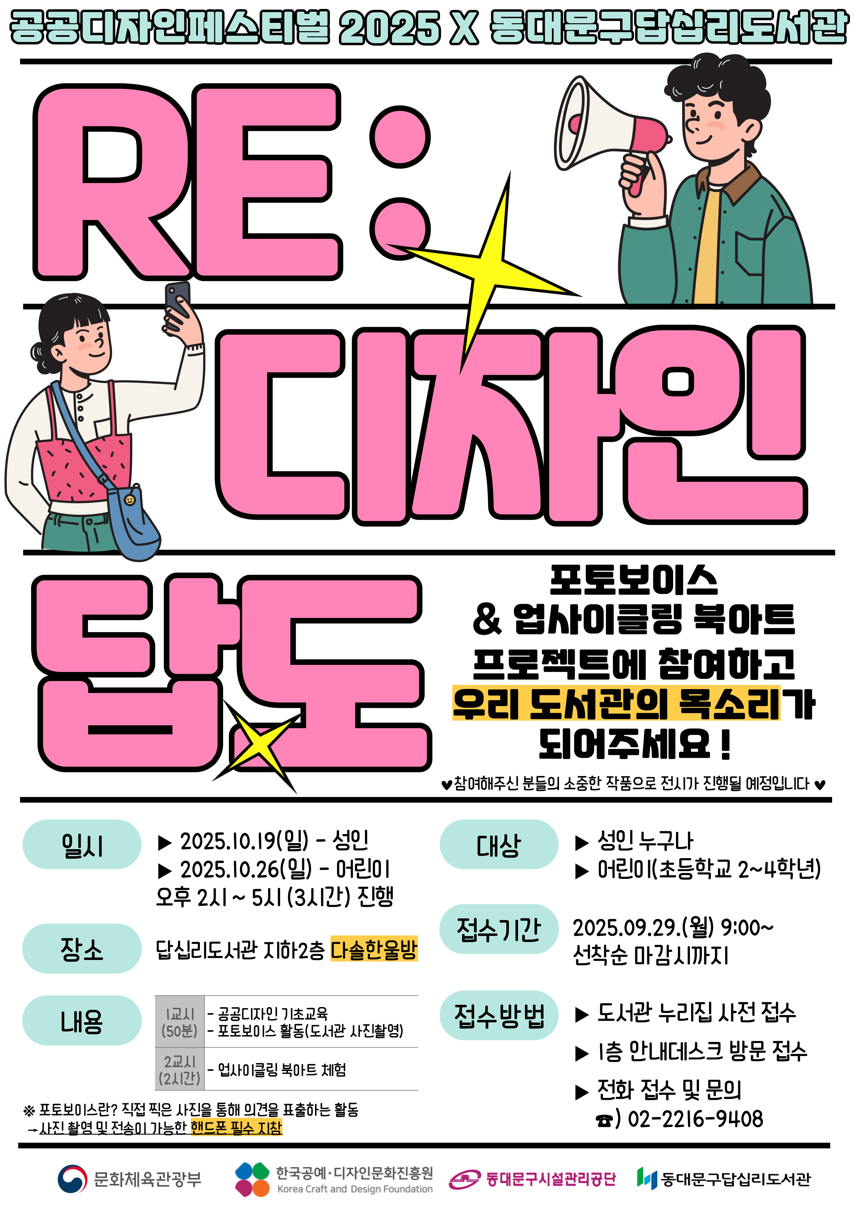 📣<공공디자인페스티벌 2025>와 답십리도서관이 함께합니다! 포토보이스&업사이클링 북아트 프로젝트 <RE:디자인 답도>에 참여하고 우리 도서관의 목소리가 되어주세요 ! 🥰 👉 포토보이스란? 사진으로 의견을 표출하는 활동 👉 업사이클링 북아트는? 버려지는 폐도서를 활용한 작품 활동 * 홍보 목적의 사진 촬영이 진행됩니다. 촬영에 동의하시는 분만 신청 바랍니다. (모자이크 처리) * 도서관을 촬영하는 활동이 포함되어 있습니다. 촬영이 가능한 핸드폰을 꼭 지참해주시기 바랍니다. (신청 바로가기) - 클릭! ![]() |