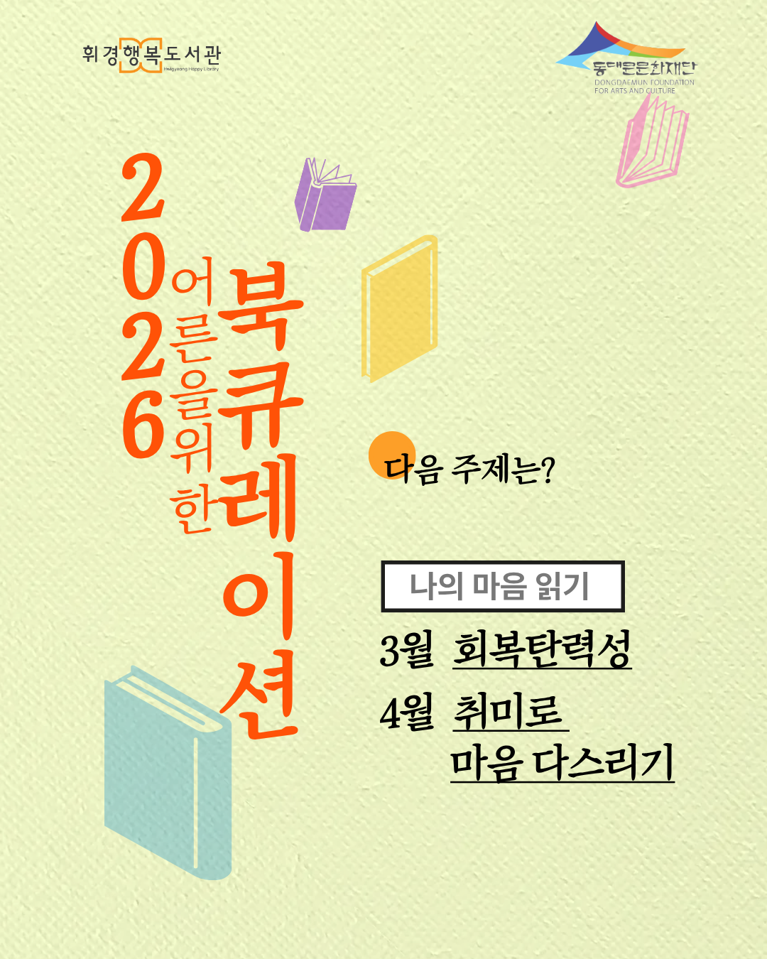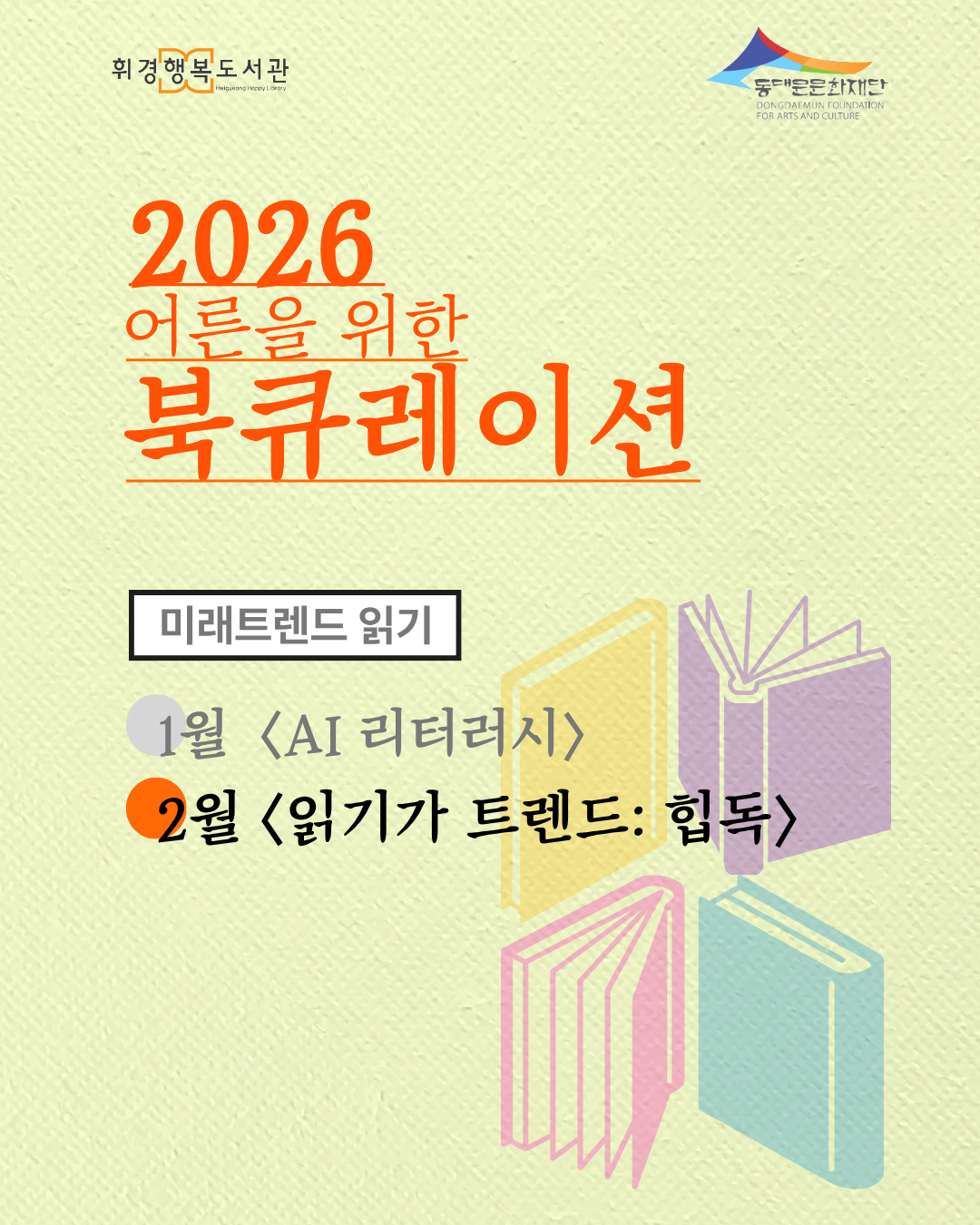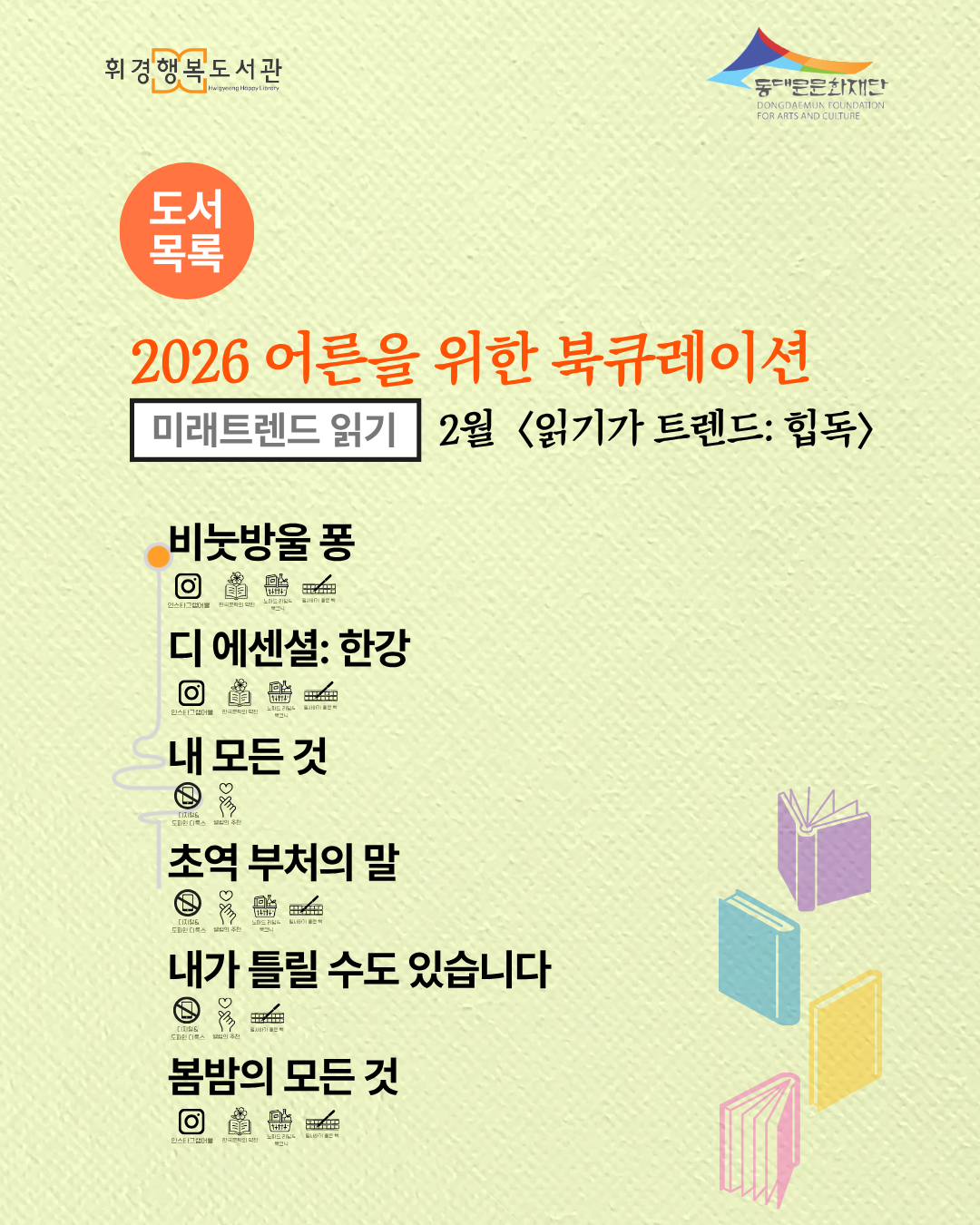 📚2026년 휘경행복도서관 2월 북큐레이션 주제: ⌈미래 트렌드 읽기⌋ '읽기가 트렌드: 힙독' 휘경행복도서관에서 운영하는 '미래 트렌드 읽기' 북큐레이션, 2월의 주제는 '읽기가 트렌드: 힙독'입니다. 전시 기간: 2026년 2월 한달간 전시 장소: 휘경행복도서관 3층 일반열람실 단순한 지식 습득을 넘어 독서를 힙한 문화로 즐기는 '텍스트힙' 트렌드를 소개합니다. 휘경행복도서관이 선정한 2월의 도서들과 함께, 읽는 행위 그 이상의 세련된 가치를 경험해 보시기 바랍니다. ![]() ![]() ![]() ![]() ![]()