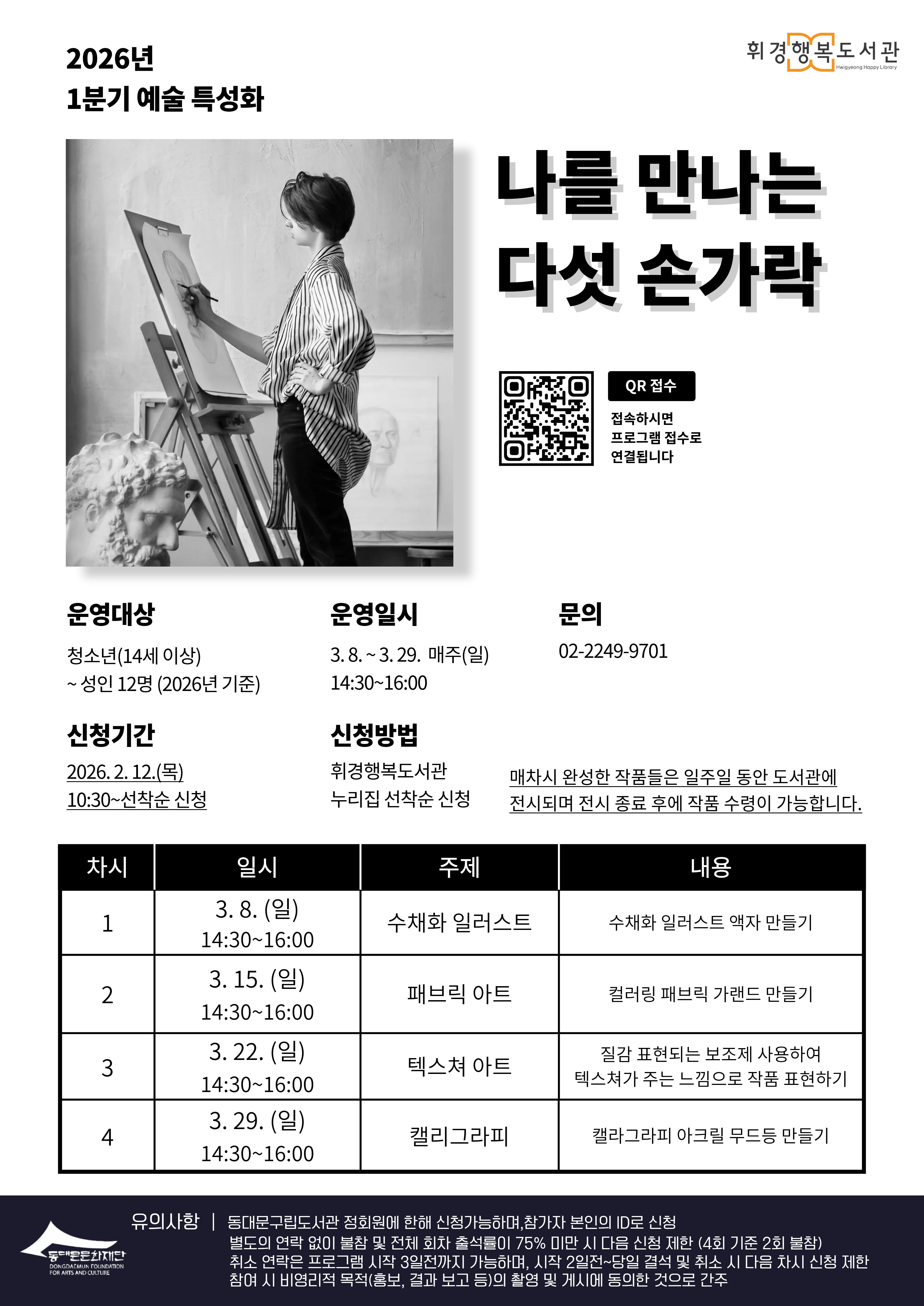 ★ 휘경행복도서관 2026년 1분기 예술특성화 프로그램 안내 ★ 프로그램명: 나를 만나는 다섯 손가락 신청일시: 2026. 2. 12.(목) 10:30~선착순 마감 신청방법: 휘경행복도서관 누리집 선착순 신청 신청바로가기(클릭) ⦁ 대상: 14세 이상 청소년~성인 12명(2026년 기준) ⦁ 일시: 3월 8일~3월 29일, 매주 일요일, 오후 2시 30분~4시 [총4회] ⦁ 장소: 휘경행복도서관 3층 프로그램실 ⦁ 문의: 02-2249-97001 ![]() ![]() |