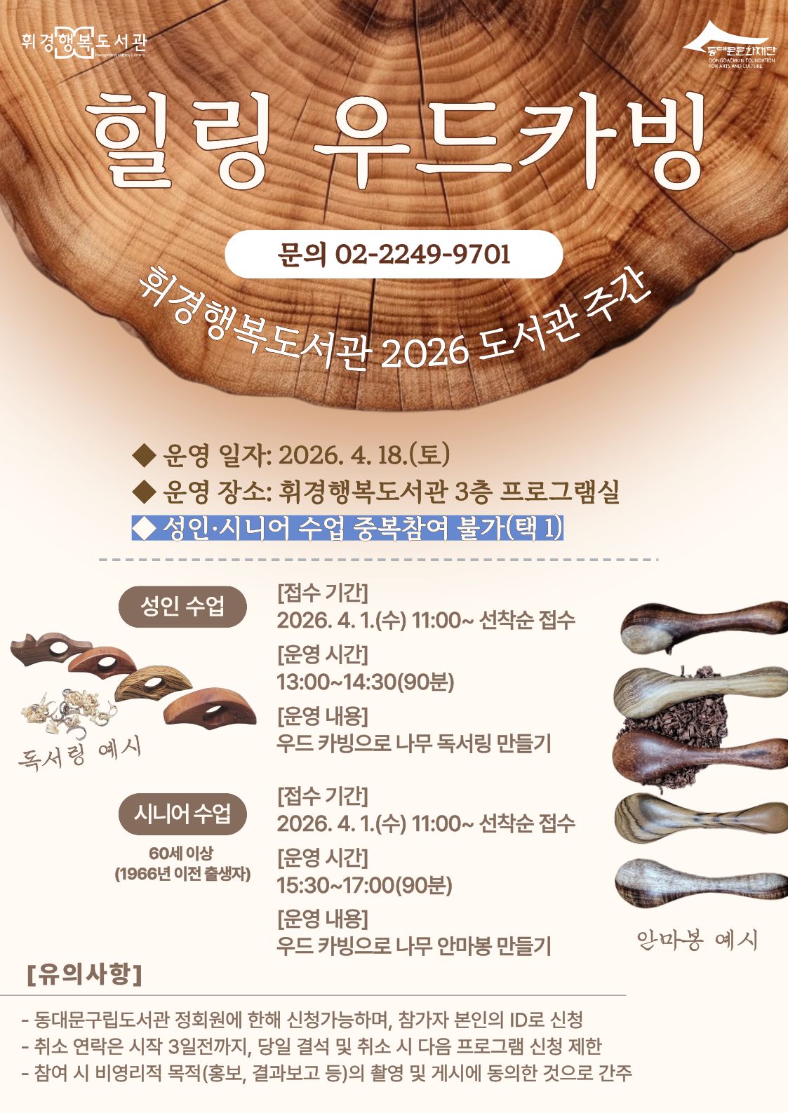![]() [휘경행복도서관] 2026년 도서관의 날·도서관 주간 행사: 시끌벅적! 도서관 봄나들이 ※ 성인 프로그램과 시니어 프로그램 중복 참여 불가(택 1) ⚒️ [체험] 힐링 우드카빙 Ⅰ