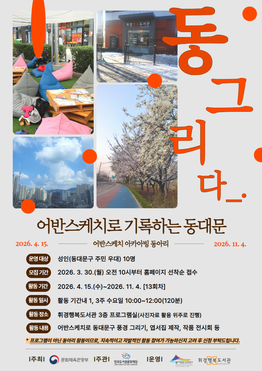| 제목 | [휘경행복도서관] [공모] 2026년 문화예술 동아리 활동 지원 사업 <동그리다> 운영 안내 |
