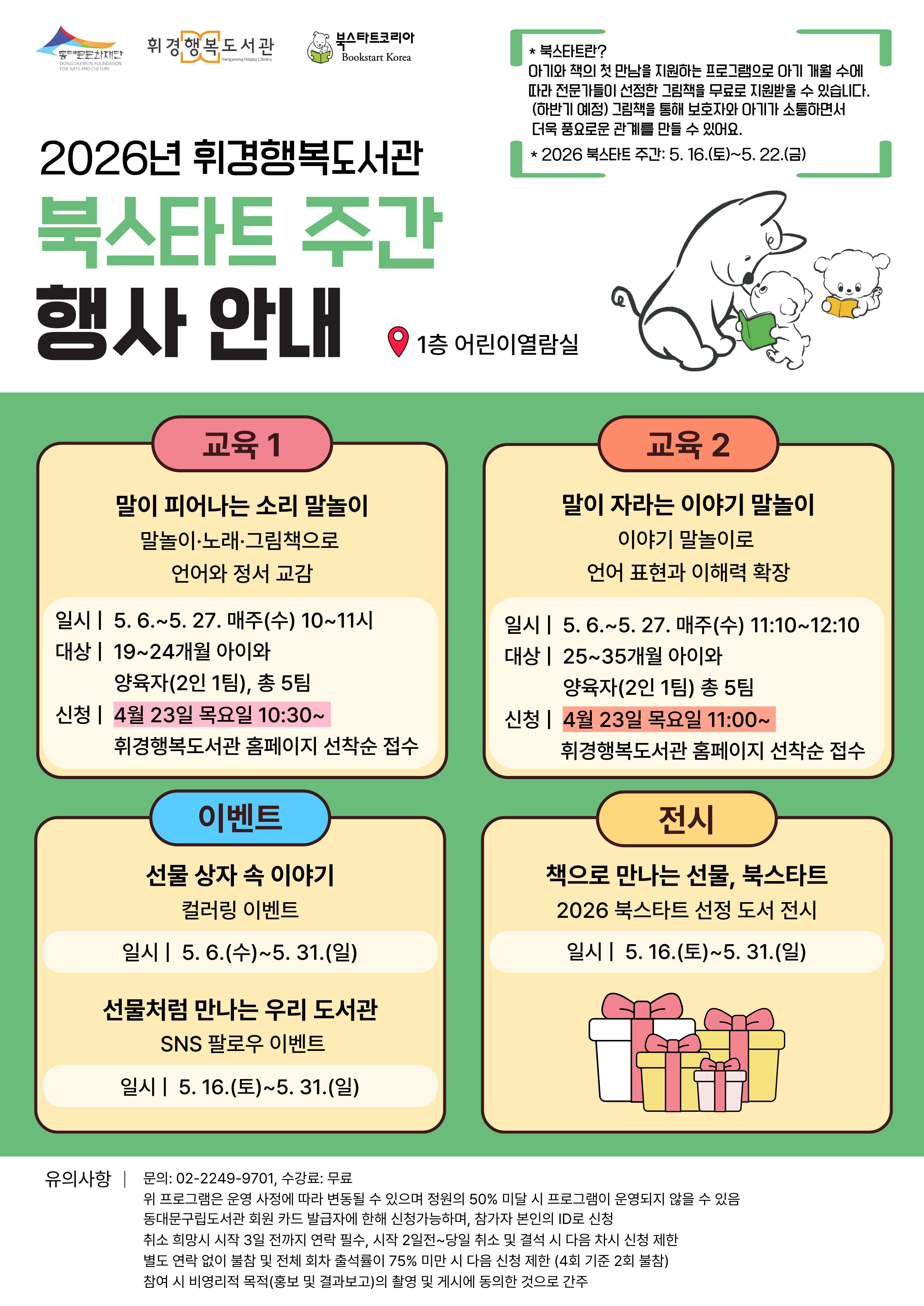 ![]() [휘경행복도서관] 🎉 2026년 북스타트 주간 행사 안내 🎉 ✅ 신청 바로가기(클릭) ✅ 문의: 02-2249-9701 [교육 1] 말이 피어나는 소리 말놀이 💬 '말놀이·노래·그림책으로 언어와 정서 교감' 운영일시: 2026. 5. 6.(수)~5. 27.(수) 매주 수요일, 10:00~11:00 대상: 19~24개월 아이와 양육자 (2인 1팀, 총 5팀) 장소: 휘경행복도서관 1층 어린이열람실 신청기간: 2026. 4. 23. (목) 10:30~선착순 마감 신청방법: 휘경행복도서관 누리집 선착순 접수 [교육 2] 말이 자라는 이야기 말놀이 💬 '이야기 말놀이로 언어 표현과 이해력 확장' 운영일시: 2026. 5. 6.(수)~5. 27.(수) 매주 수요일, 11:10~12:10 대상: 25~35개월 아이와 양육자 (2인 1팀, 총 5팀) 장소: 휘경행복도서관 1층 어린이열람실 신청기간: 2026. 4. 23. (목) 11:00~선착순 마감 신청방법: 휘경행복도서관 누리집 선착순 접수 [이벤트 1] 선물 상자 속 이야기 🖌️ '선물 상자 도안 컬러링 이벤트' 운영일시: 2026. 5. 6.(수)~5. 31.(일) 대상: 도서관 이용자 장소: 휘경행복도서관 1층 어린이열람실 [이벤트 2] 선물처럼 만나는 우리 도서관 ✅ 'SNS 팔로우 이벤트' 운영일시: 2026. 5. 16.(토)~5. 31.(일) 대상: 도서관 이용자 장소: 휘경행복도서관 1층 어린이열람실 [전시] 책으로 만나는 선물, 북스타트 📚 '2026 북스타트 선정 도서 전시' 운영일시: 2026. 5. 16.(토)~5. 31.(일) 대상: 도서관 이용자 장소: 휘경행복도서관 1층 어린이열람실 <유의사항> - 프로그램은 운영 사정에 따라 변경될 수 있습니다. - 동대문구립도서관 정회원에 한해 신청가능하며, 참가자 본인의 ID로 신청해주시기 바랍니다. * 어린이 프로그램은 어린이 ID로 신청가능합니다. - 취소 연락은 시작 3일전까지 하셔야하며, 시작 2일전~당일 취소하시거나 결석할 경우 다음 프로그램 신청이 제한될 수 있습니다. - 참여 시 비영리적 목적(홍보, 결과보고 등)의 촬영 및 게시에 동의하신 것으로 간주합니다. - 정원의 50% 미달 시 프로그램이 운영되지 않을 수 있습니다. |