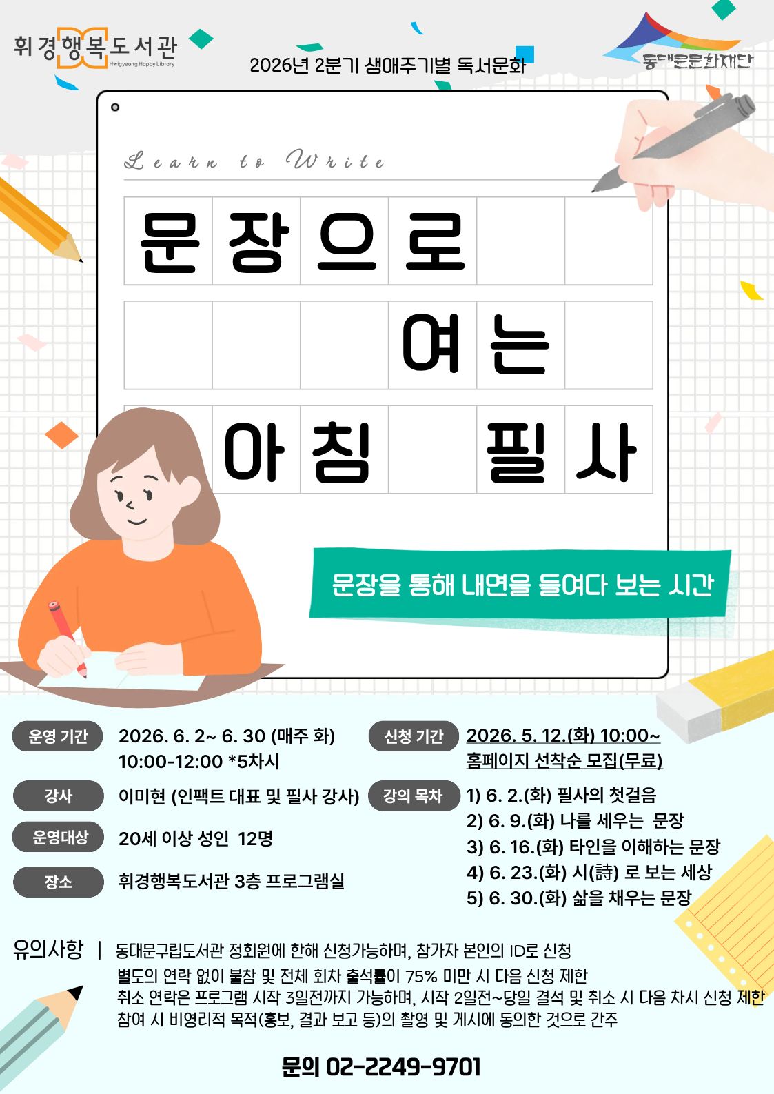 ![]() [휘경행복도서관] 2026년 2분기 독서·문화프로그램 <문장으로 여는 아침 필사> 안내 - 문장을 통해 나의 내면을 들여다보는 시간 📝 ✒️ 운영기간: 2026. 6. 2.~6. 30. 매주 (화), 10:00~12:00 [총5회차] ✒️ 운영대상: 20세 이상 성인 12명 ✒️ 운영장소: 휘경행복도서관 3층 프로그램실 ✒️ 운영내용: 5주 과정을 통해 다양한 장르의 문장을 읽고 쓰며, 나만의 필사 습관 형성하기 ✒️ 운영강사: 이미현 강사(인팩트 대표 및 필사 강사) ✅ 신청기간: 2026. 5. 12.(화) 오전 10시~선착순 접수 ✅ 신청방법: 휘경행복도서관 홈페이지 선착순 신청 📞 문의: 02-2249-9701 |