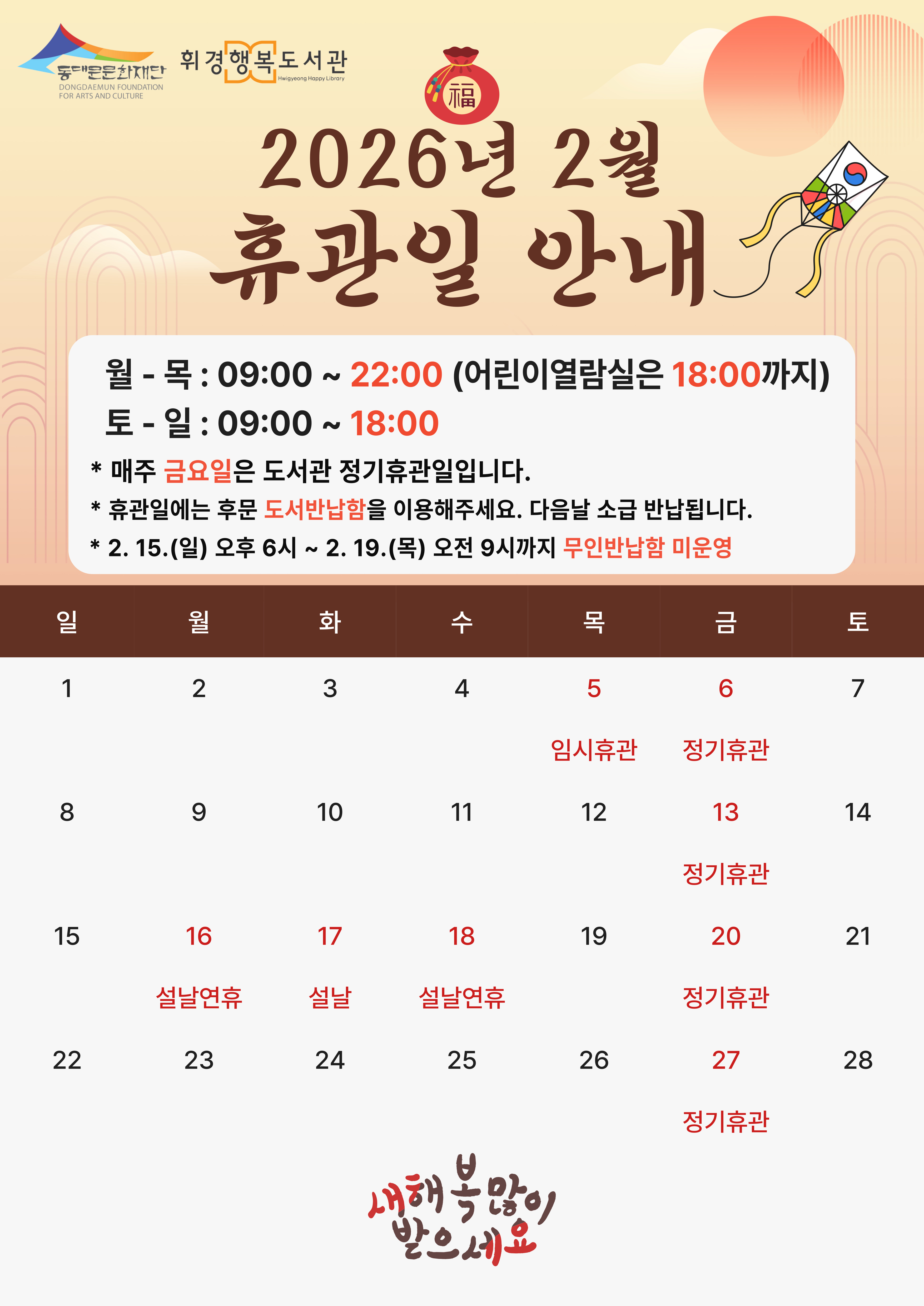 ![]() 📢휘경행복도서관 2026년 2월 휴관일 안내 2026년 새해 복 많이 받으세요! ⏰운영시간 - 월~목 : 09:00 ~ 22:00 (어린이열람실 제외) - 토~일 : 09:00 ~ 18:00 💡 매주 금요일 정기휴관 / 일요일을 제외한 법정공휴일 휴관 - 2/5(목) 임시휴관(도서관 시설 보수 공사) - 2/6(금) 정기휴관 - 2/13(금) 정기휴관 - 2/16(월)~2/18(수) 설 연휴 휴관 - 2/20(금) 정기휴관 - 2/27(금) 정기휴관 ☑ 휴관일에는 열람실 이용 및 도서 대출이 불가합니다. ☑ 2/15(일) 오후 6시부터 ~ 2월 19일(목) 오전 9시까지 무인반납함 미운영을 안내드립니다. ☎ 문의 : 02-2249-9701 |