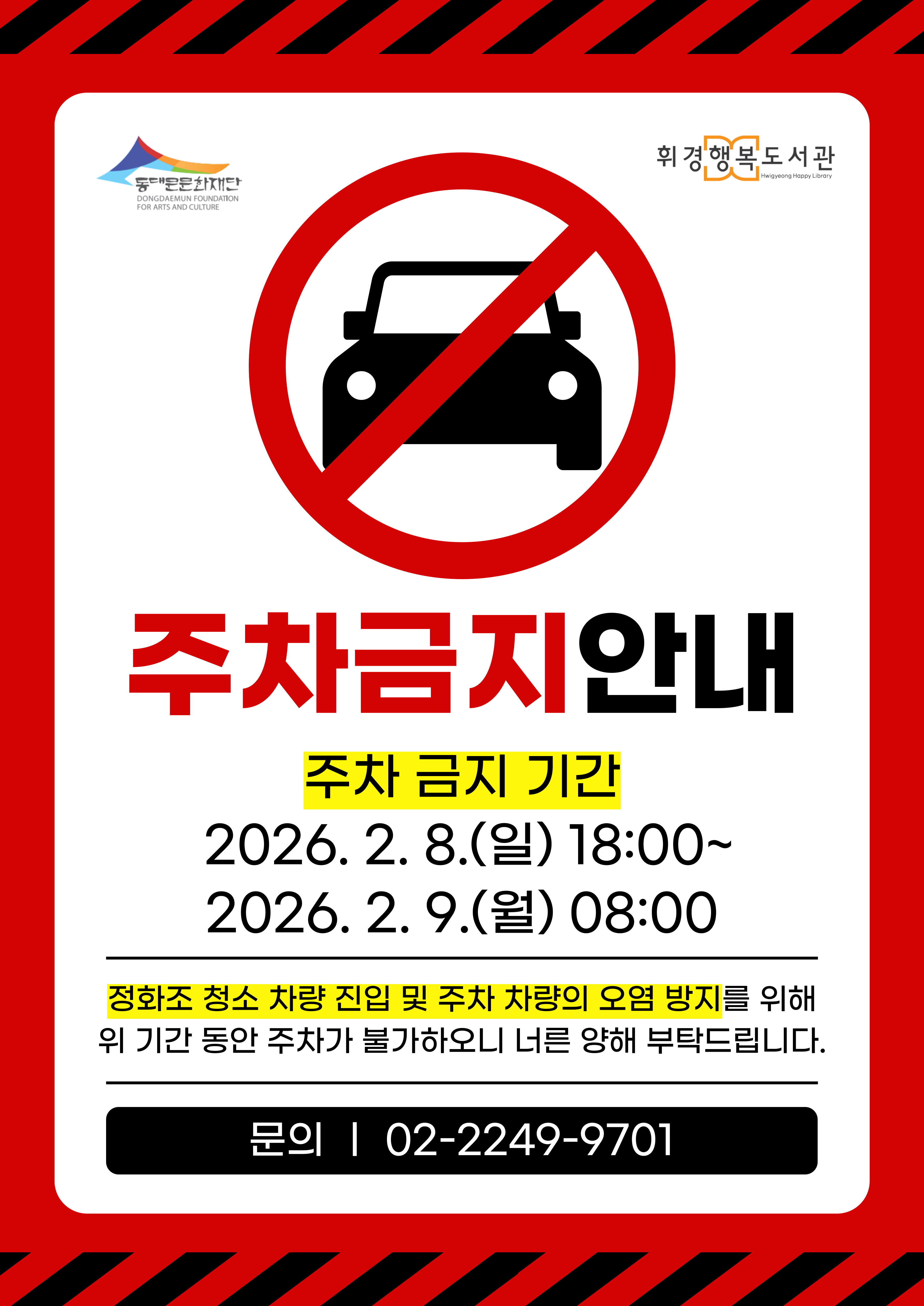 ![]() [휘경행복도서관] 주차 금지 안내 ○주차 금지 기간: 2026. 2. 8.(일) 18:00~2026. 2. 9.(월) 08:00 ○주차 금지 사유: 정화조 청소 차량 진입 및 주차 차량의 오염 방지 ○주차 금지 공간: 휘경행복도서관 주차장 ○문의: 02-2249-9701 원활한 청소 진행을 위해 이용자분들의 너른 양해와 협조 부탁드립니다. |