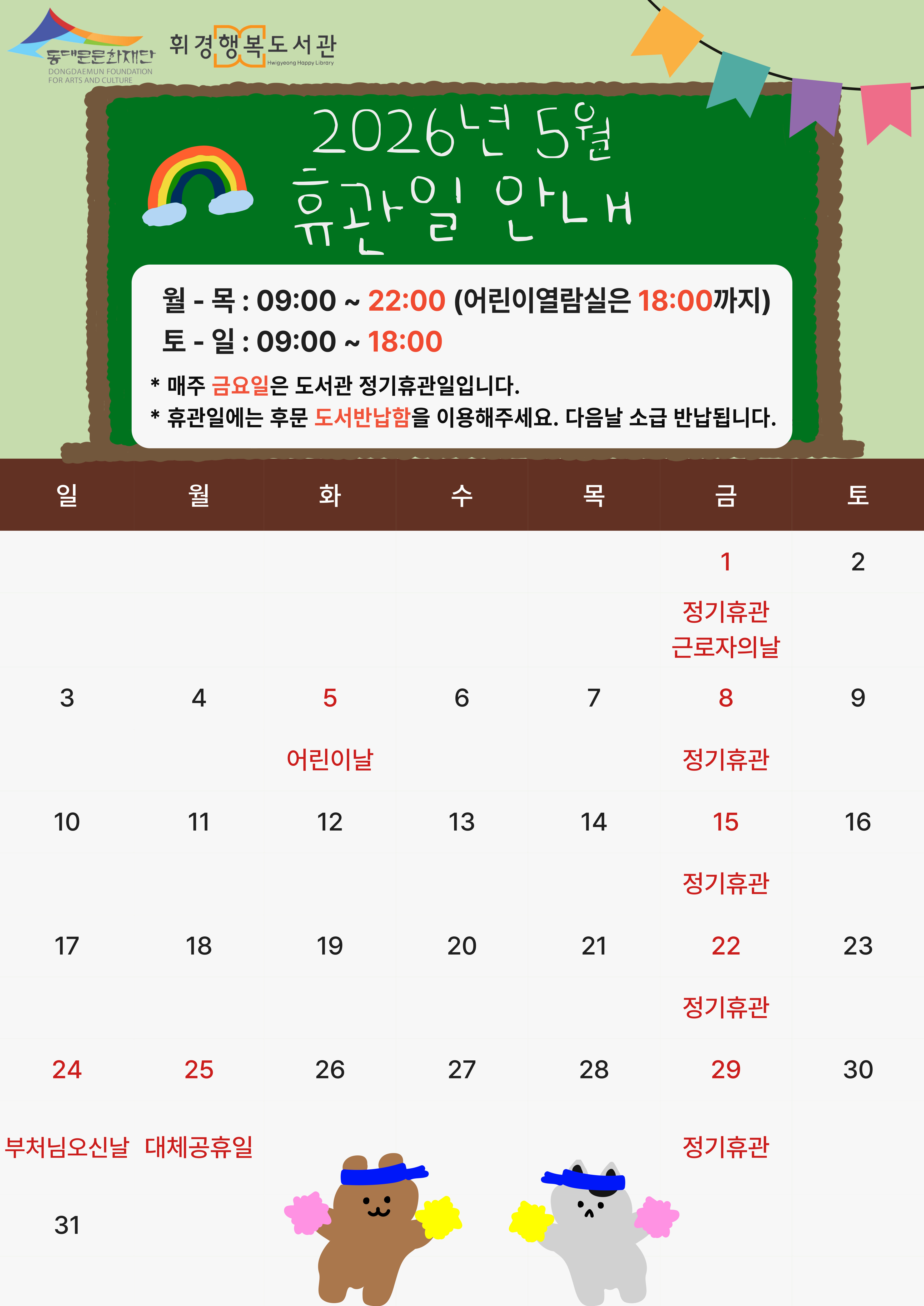 ![]() 📢휘경행복도서관 2026년 5월 휴관일 안내 ⏰운영시간 - 월~목 : 09:00 ~ 22:00 (어린이열람실 제외) - 토~일 : 09:00 ~ 18:00 💡 매주 금요일 정기휴관 / 법정공휴일 휴관 - 5/1(금) 정기휴관, 근로자의 날 - 5/5(화) 어린이날 - 5/8(금) 정기휴관 - 5/15(금) 정기휴관 - 5/22(금) 정기휴관 - 5/24(일) 부처님 오신 날 - 5/25(월) 대체공휴일 - 5/29(금) 정기휴관 ☑ 휴관일에는 열람실 이용 및 도서 대출이 불가합니다. ☎ 문의 : 02-2249-9701 |