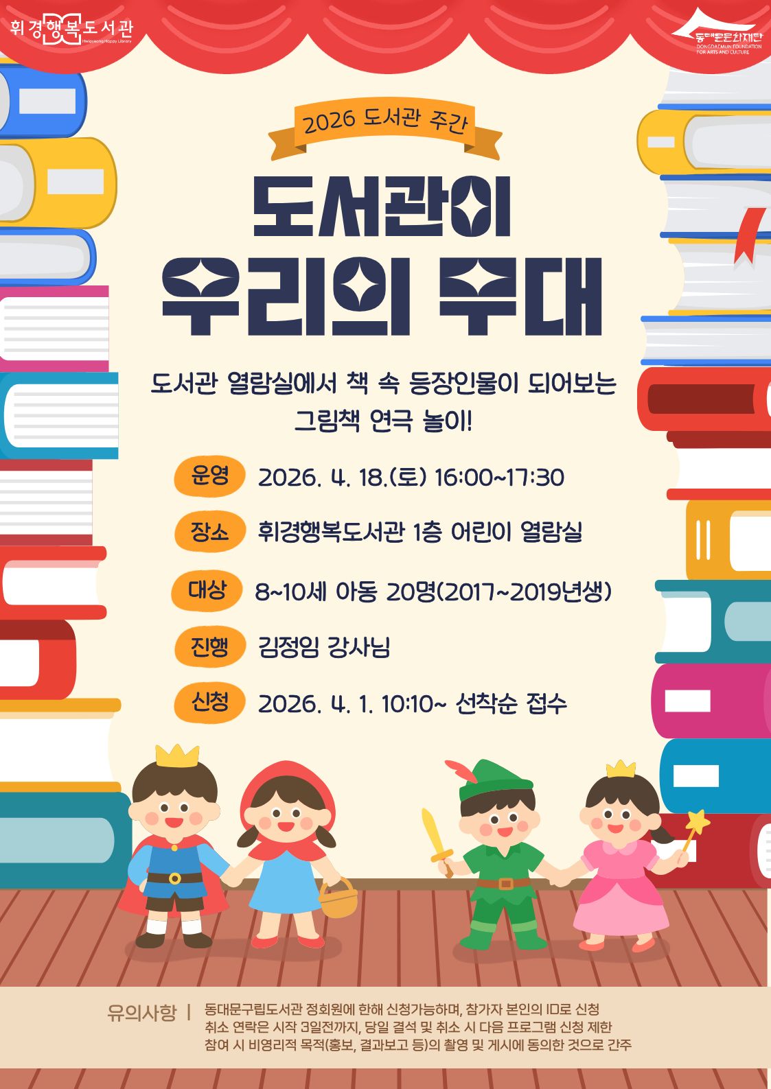 ![]() ![]() [체험] 도서관이 우리의 무대: 그림책 연극놀이 ◆ 일시: 4. 18.(토) 16:00~17:30 ◆ 대상: 8~10세 20명 (2017년생~2019년생) ◆ 장소: 휘경행복도서관 1층 어린이열람실 ◆ 내용: 도서관에서 책 속 등장인물이 되어봅시다! 그림책 연극 놀이 ◆ 신청기간: 4. 1.(수) 오전 10:10~선착순 |