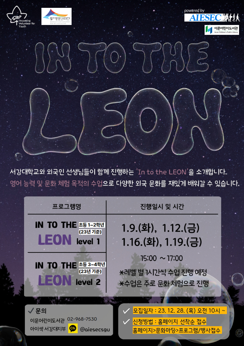 ![]() IN TO THE LEON 서강대학교와 외국인 선생님들이 함께 진행하는 'In to the LEON'을 소개합니다. 영어 학습 능력 향상보다는 문화체험 목적의 수업으로 다양한 외국 문화를 재밌게 배워갈 수 있습니다. * IN TO THE LEON level 1 - 대상 : 초등 1~2학년 10명 (23년 기준) - 운영일시 : 1월 9일(화), 1월 12일(금), 1월 16일(화), 1월 19일(금). 오후 3시 ~ 4시 - 장소 : 이문어린이도서관 1층 이야기방 * IN TO THE LEON level 2 - 대상 : 초등 3~4학년 10명 (23년 기준) - 운영일시 : 1월 9일(화), 1월 12일(금), 1월 16일(화), 1월 19일(금). 오후 4시 ~ 5시 - 장소 : 이문어린이도서관 1층 이야기방 V 신청기간 2023. 12. 28. (목) 오전 10시 ~ 마감시 V 신청 방법 홈페이지 선착순 접수 홈페이지>문화마당>프로그램/행사 접수 신청바로가기 V 문의 이문어린이도서관 02-968-7530 아이섹 서강대지부 카카오톡 ID @aiesecsgu ※유의사항 모집인원의 50% 미달 시 운영되지 않을 수 있습니다. 참여 시 도서관 홍보 및 결과 보고 등 비영리적 목적을 위한 촬영과 게시에 동의한 것으로 간주합니다. |