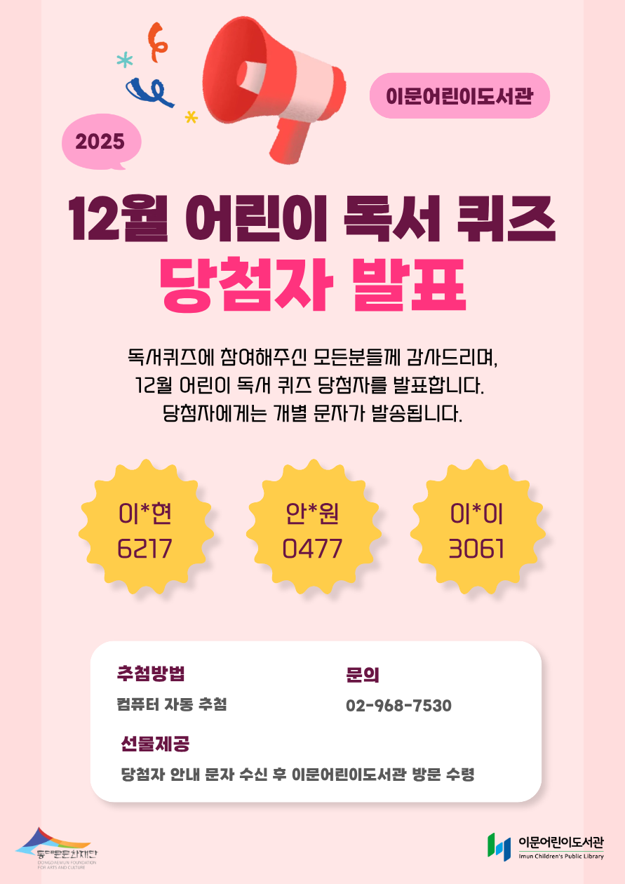 [이문어린이도서관] 2025년 12월 어린이 독서퀴즈 당첨자 안내