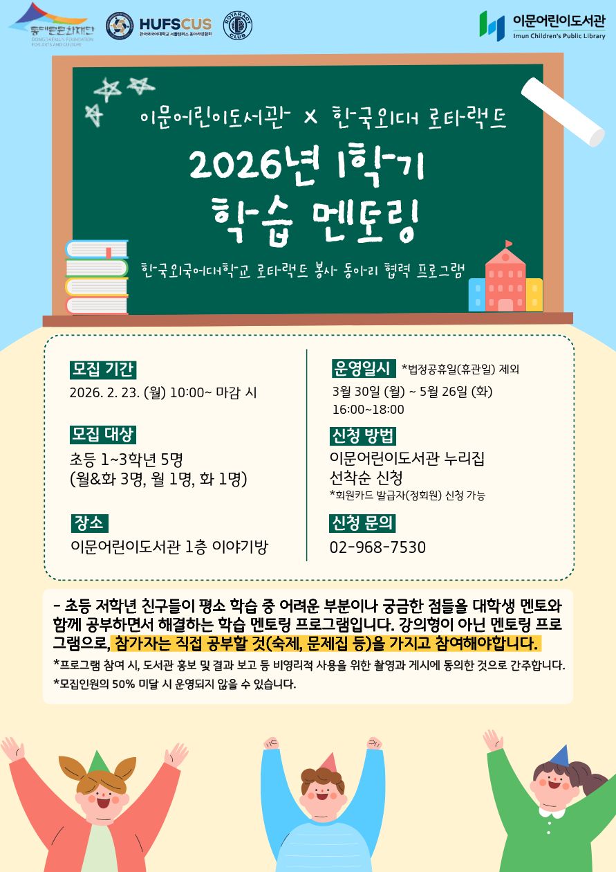 ![]() [이문어린이도서관] 한국외대 로타랙트 협력 <2026년 1학기 학습 멘토링 프로그램> 모집 안내 - 이문어린이도서관은 한국외국어대학교 봉사동아리 <로타랙트>와 협력하여 초등 저학년 대상 학습 멘토링 프로그램을 운영합니다. - 모집기간: 26. 2. 23.(월) 오전 10시~마감 시 - 운영기간: 26. 3. 30.(화) ~ 5. 26.(화), 매주 월~화, 오후 4시~6시 ** 세부일정 안내 - 3월: 30일, 31일 - 4월: 6일, 7일, 27일, 28일 - 5월: 4일, 11일, 12일, 18일, 19일, 26일 (법정공휴일 및 로타랙트 동아리 사정으로 인한 4월 13일, 4월 20일 휴강) - 장소: 이문어린이도서관 1층 이야기방 - 신청대상: 초등학교 1~3학년 5명 - 신청방법: 이문어린이도서관 누리집 선착순 신청 - 문의: 02-968-7530 ** 유의사항 1) 동대문구립도서관 회원카드 발급자(정회원)에 한해 신청 가능하며, 참가자 본인(어린이)의 ID로 신청해주시기 바랍니다. 2) 모집인원의 50% 미달 시 운영되지 않을 수 있습니다. 3) 프로그램 참여 시, 도서관 홍보 및 결과 보고 등 비영리적 사용을 위한 촬영과 게시에 동의한 것으로 간주합니다. →신청바로가기 |