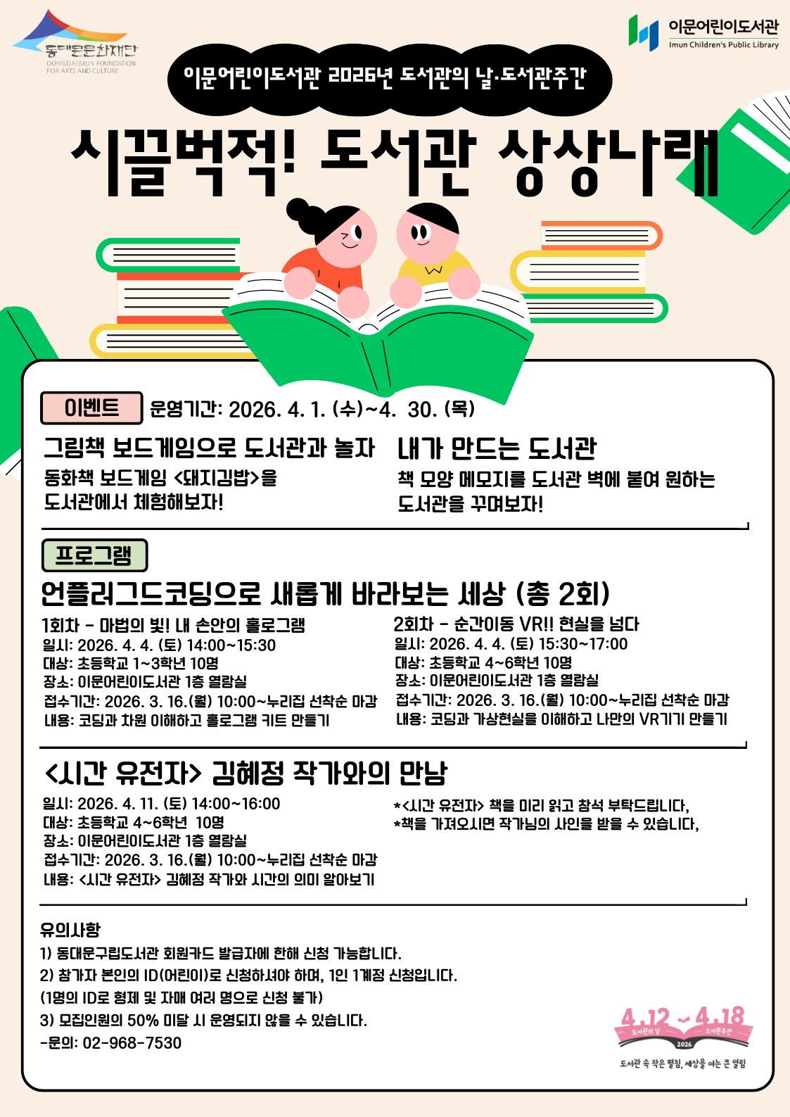 ![]() <이문어린이도서관 2026년 도서관의 날·도서관주간 행사 안내> ♦ 프로그램 : 언플러그드코딩으로 새롭게 바라보는 세상 (2회차/학년별 1회차) - 코딩을 이해하고 관련 만들기 활동하기 신청 기간 : 3월 16일 월요일 10시~ 선착순 마감 ※ 신청 바로가기(해당 프로그램을 누르시면 신청페이지로 이동합니다.) 1. (초등 1~3학년) 마법의 빛! 내 손안의 홀로그램 2. (초등 4~6학년) 순간이동 VR!! 현실을 넘다 ♦ 강연 : <시간 유전자> 김혜정 작가와의 만남 - 김혜정 작가와 함께 시간의 의미에 대해 이야기나누고 나에 대해 알아보기 대상: 초등 4~6학년 10명 신청 기간 : 3월 16일 월요일 10시~ 선착순 마감 ※ 신청 바로가기(해당 프로그램을 누르시면 신청페이지로 이동합니다.) (초등 4~6학년) <시간 유전자> 김혜정 작가와의 만남 ♦ 행사 1 : 그림책 보드게임으로 도서관과 놀자 - 해당 기간(4월 1일~4월 30일)동안 보드게임 <돼지김밥> 체험 ♦ 행사 2 : 내가 만드는 도서관 - 해당 기간(4월 1일~4월 30일)동안 책 모양 메모지를 도서관 벽에 붙여 원하는 도서관을 꾸미기 ※ 안내사항 1. 도서관 행사는 도서관 회원에 한해 신청받으며, 신청은 도서관 누리집에서 진행합니다. ※ 모집인원의 50% 미달시 운영되지 않을 수 있으며, 행사 시작 2일 전 또는 이후 진행 중 취소시 다음 프로그램 신청이 불가합니다. 2. 촬영된 사진 및 영상은 비상업적 용도로 사용하며, 동의하지 않을 경우 참여의 제한이 있습니다. 3. 문의사항 : 이문어린이도서관 (02-968-7530) |