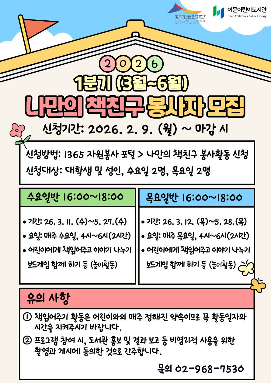 [이문어린이도서관] 2026년 1분기 (3월~ 5월) 자원봉사자 모집 안내