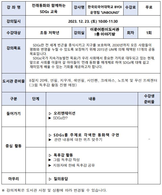| 강좌명 | 이문어린이 한국외대 BYOI 팀 UNBOUND 주최 <전래 동화와 함께하는 SDGs 교육> |
