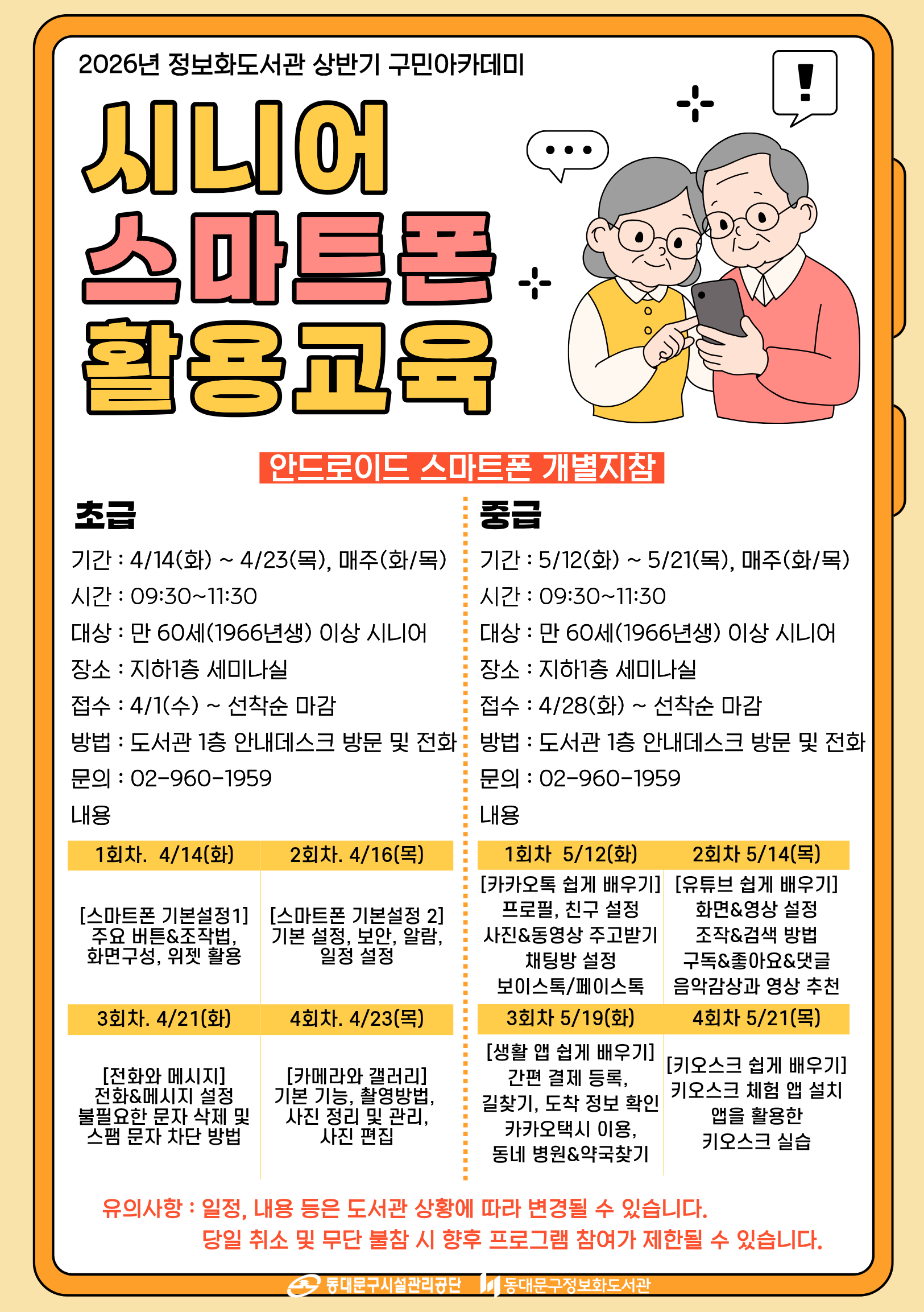[2026년 구민아카데미] 📱시니어를 위한 '스마트폰 활용교육(초급/중급)' 참여자 모집