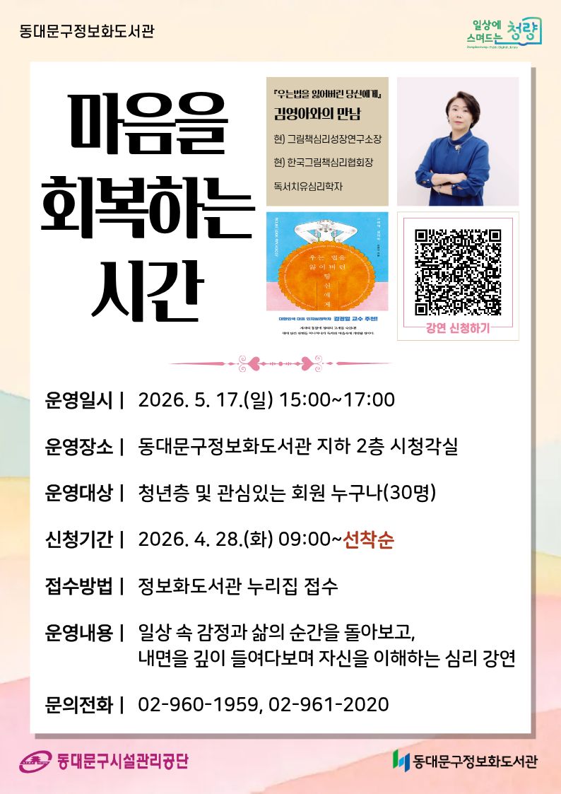 요즘 지친 마음, 그냥 두고 계시진 않나요? 잠시 멈춰 나를 들여다보는 시간, 마음을 회복하는 시간에 여러분을 초대합니다. 나의 감정과 삶을 이해하는 심리 이야기, 이번 기회에 함께해보세요. 📍일시: 5/17(일) 15:00~17:00 📍장소: 동대문구정보화도서관 지하 2층 시청각실 📍대상: 청년층 및 관심있는 회원 누구나 30명(선착순) ✔ 4/28(화) 09:00부터 신청 시작! ☞서둘러 주세요 🙌