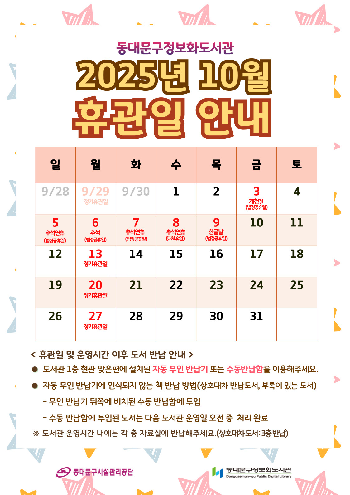 | 제목 | [공지] 2025년 10월 동대문구정보화도서관 휴관일 안내 |