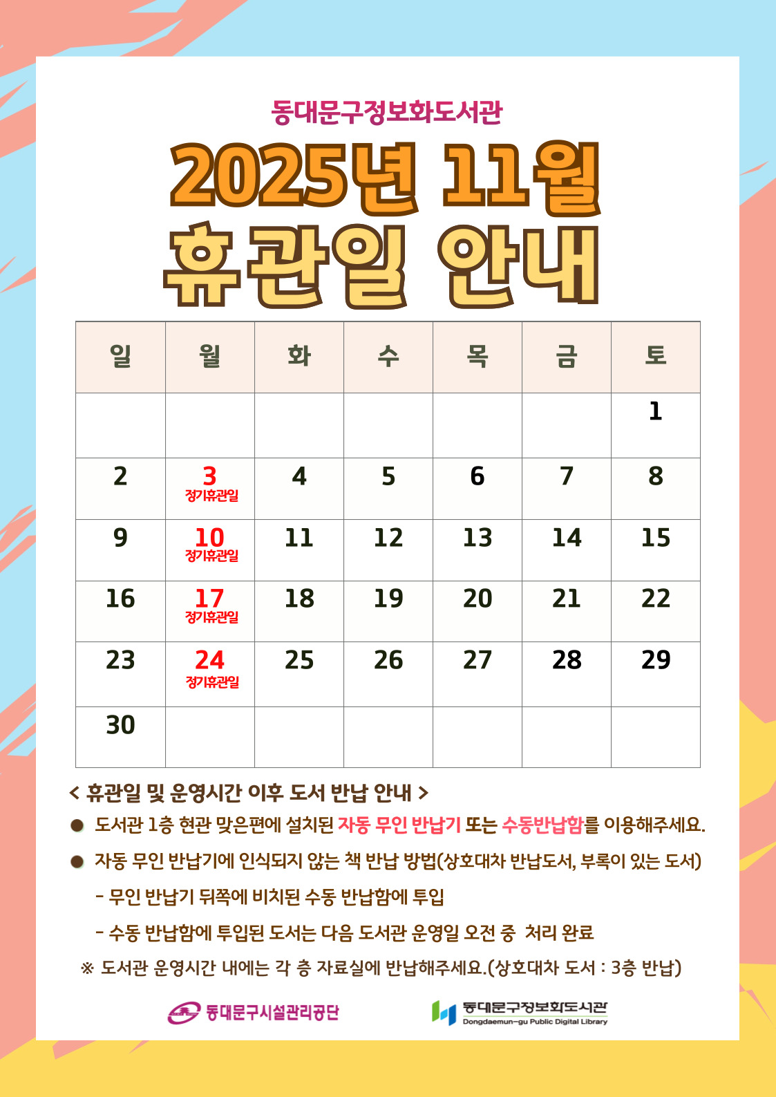 📣2025년 11월 동대문구정보화도서관 휴관일 안내드립니다.