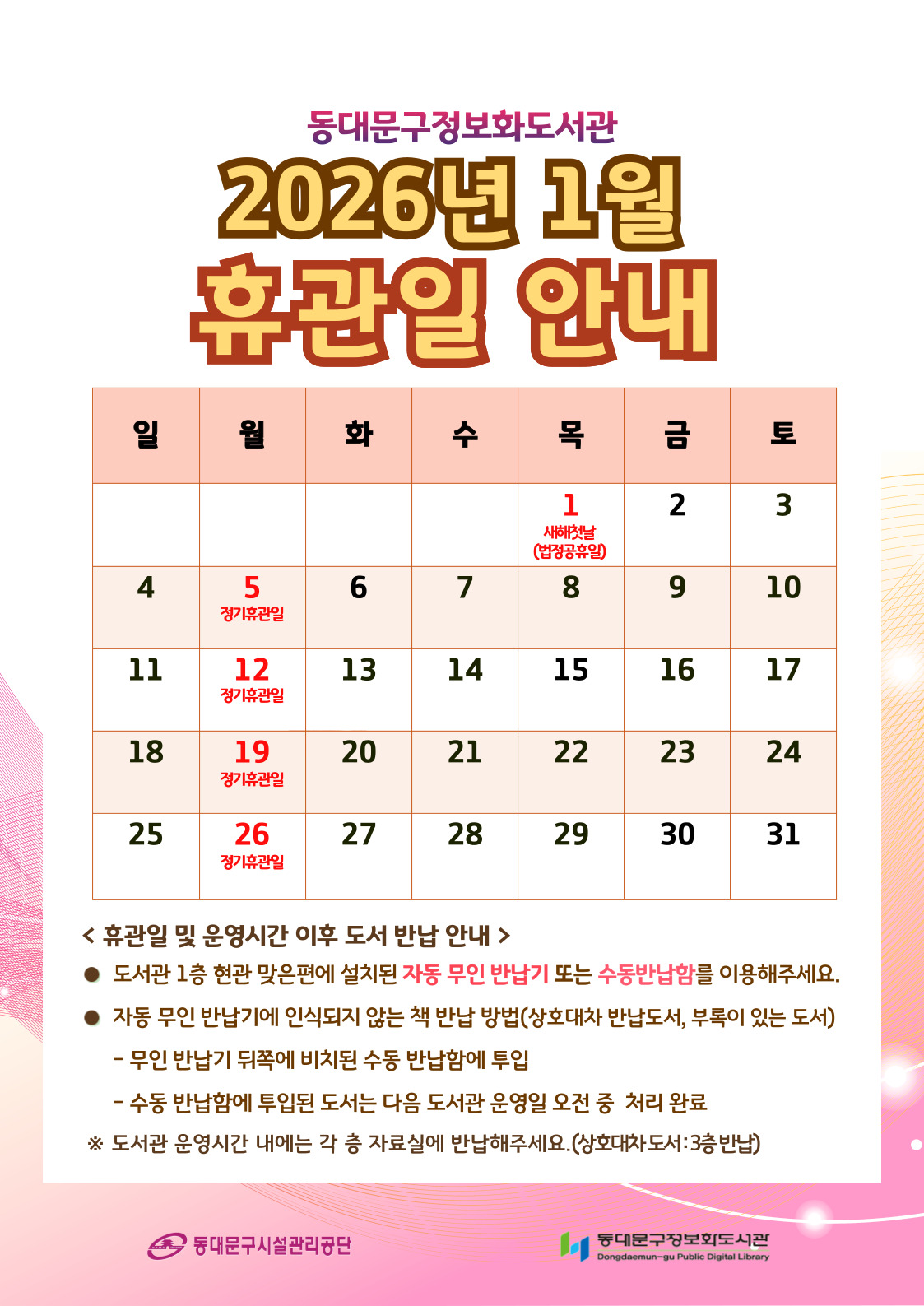 📣2026년 1월 동대문구정보화도서관 휴관일 안내드립니다.