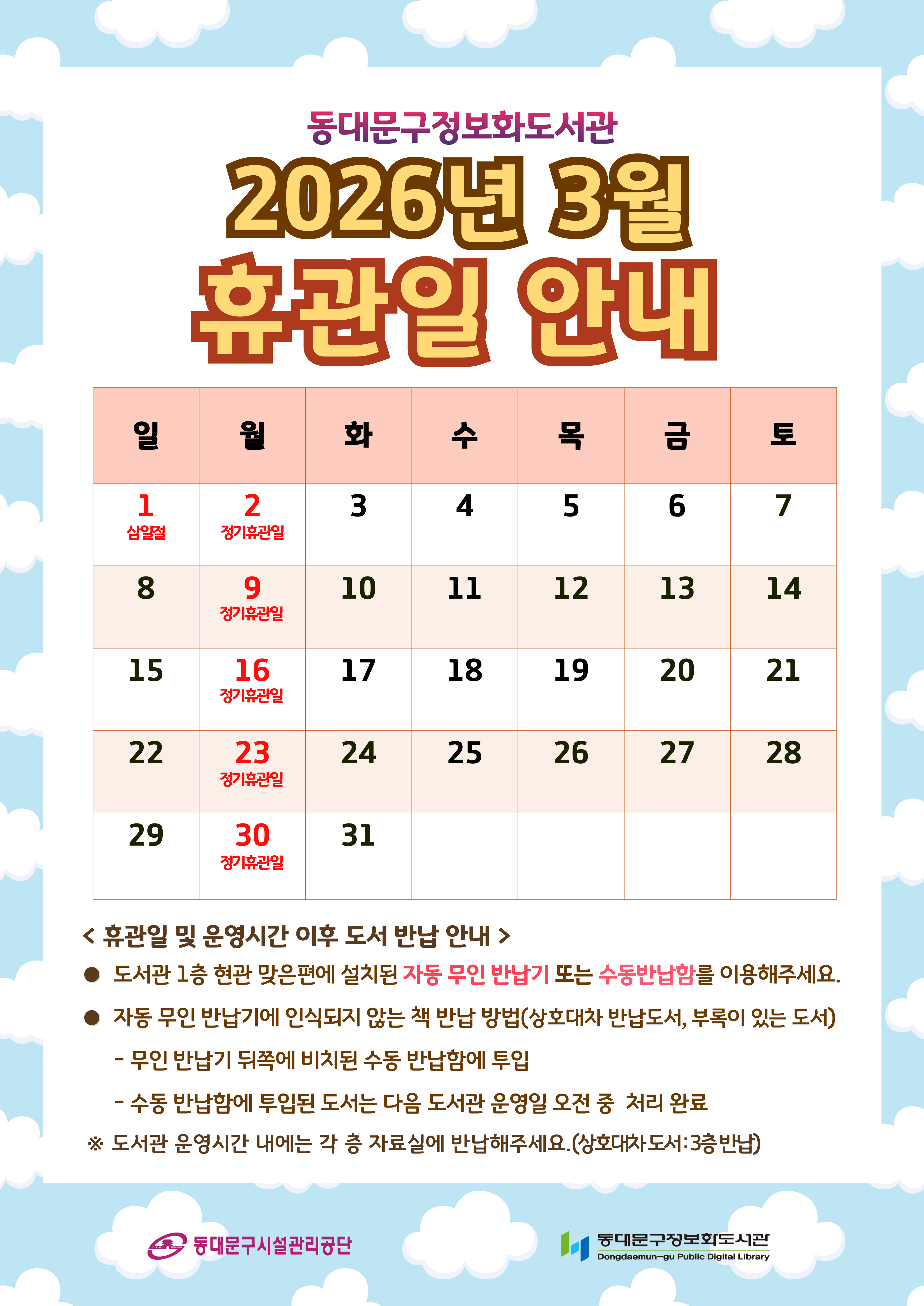 📣2026년 3월 동대문구정보화도서관 휴관일 안내드립니다.
