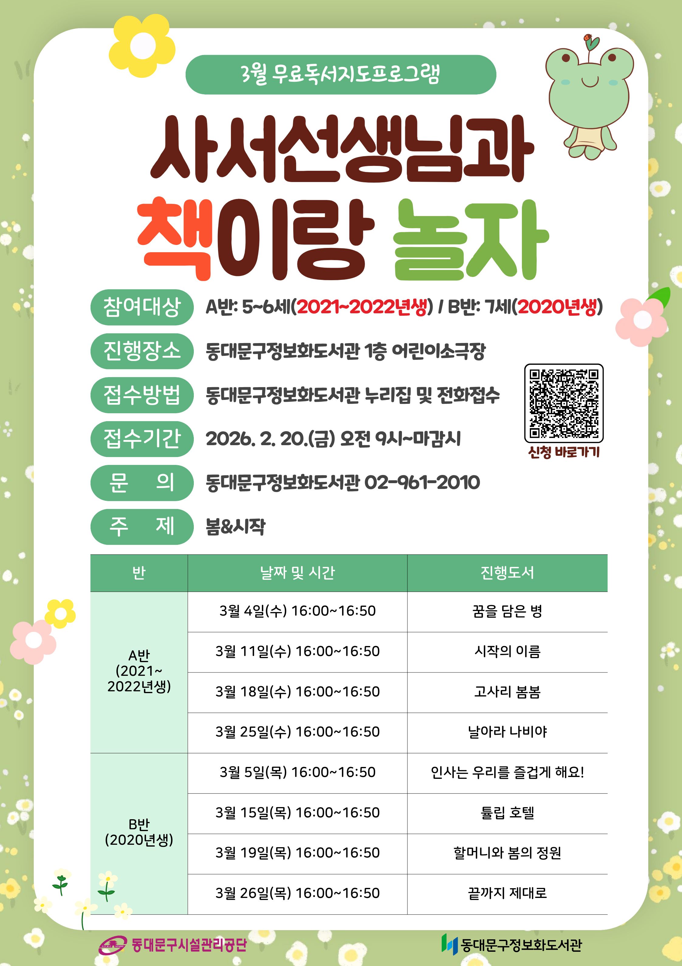 | 강좌명 | 정보화 [책놀이] ☘️3월 사서선생님과 책이랑 놀자 B반 7세, 2019년생(3/5, 3/12, 3/19, 3/26) 매주 목요일 오후4시 |