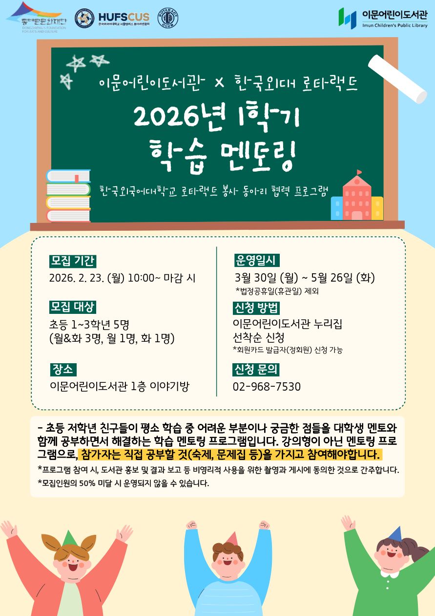 | 강좌명 | 이문어린이 [월요일반] <한국외대 로타랙트 협력> 2026년 1학기 학습 멘토링 |