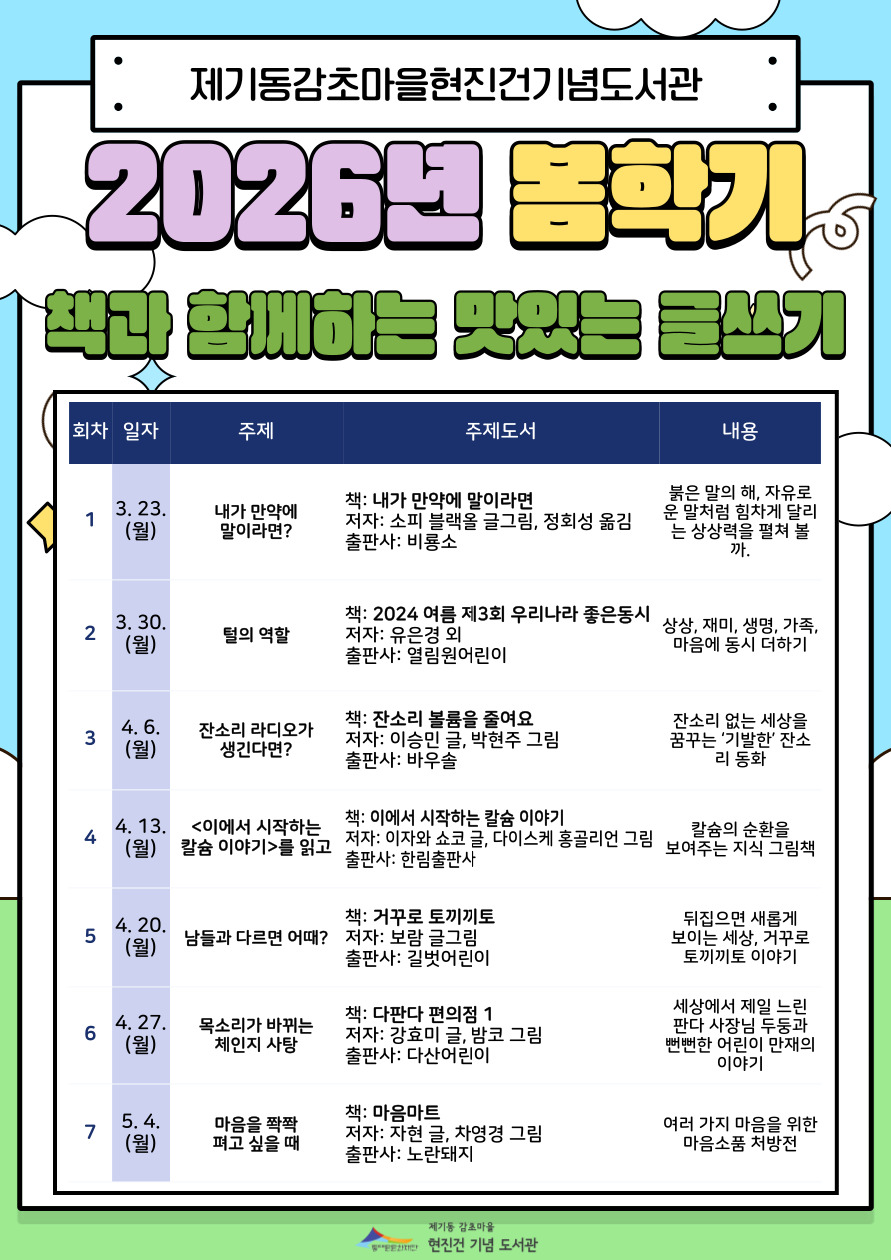 ![]() [제기동감초마을현진건기념도서관] 2026 봄학기(3~5월) 책과 함께하는 맛있는 글쓰기 • 수강기간: 3월 23일(월) ~ 5월 4일(월), 5층 프로그램실 대면 강좌(총 7회) • 참여대상: 어린이(2018년~2019년생) 15명 • 신청시간: 3월 4일(월) 10:00~ 선착순 마감 • 진행: 김혜정 • 유의사항: 수강자(본인) 아이디로만 접수 가능 • 문의: 02-928-3141 <프로그램 신청 전 확인 사항> * 모집정원의 50% 미달 시 운영되지 않을 수 있습니다. * 프로그램 해당 연령에 맞게 신청해 주세요. 해당 연령이 아닐 경우 신청이 취소될 수 있습니다. * 프로그램은 운영 사정에 따라 변동될 수 있습니다. * 프로그램 신청 시, 비영리적 목적에 한하여 사진 촬영 및 게시에 동의한 것으로 간주합니다. |