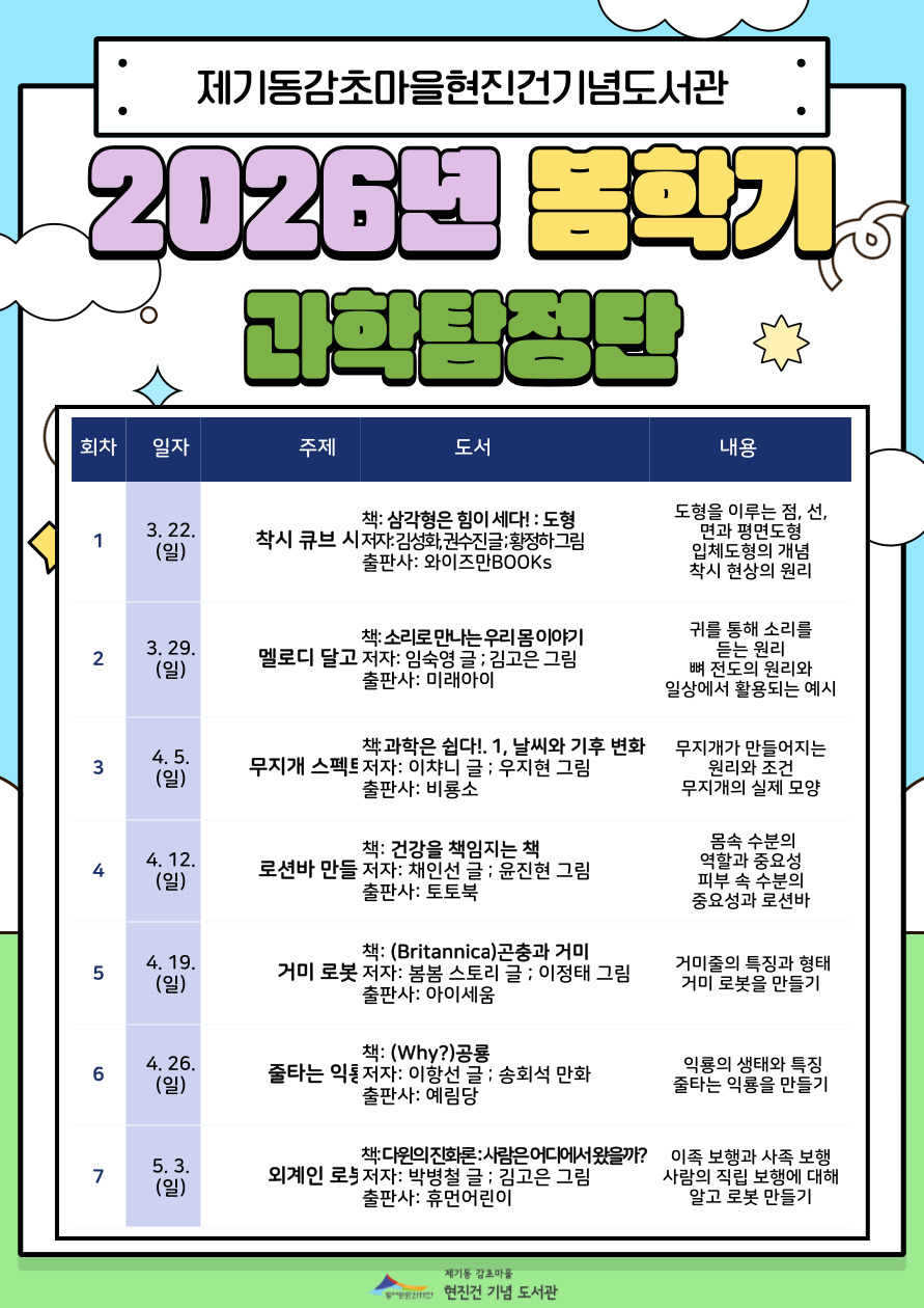 ![]() [제기동감초마을현진건기념도서관] 2026 봄학기(3~5월) 과학탐정단 • 수강기간: 3월 22일(일) ~ 5월 3일(일), 5층 프로그램실 대면 강좌(총 7회) • 참여대상: 어린이(2014년~2016년생) 12명 • 신청시간: 3월 4일(월) 11:00~ 선착순 마감 • 진행: 강선미 • 유의사항: 수강자(본인) 아이디로만 접수 가능 • 문의: 02-928-3141 <프로그램 신청 전 확인 사항> * 모집정원의 50% 미달 시 운영되지 않을 수 있습니다. * 프로그램 해당 연령에 맞게 신청해 주세요. 해당 연령이 아닐 경우 신청이 취소될 수 있습니다. * 프로그램은 운영 사정에 따라 변동될 수 있습니다. * 프로그램 신청 시, 비영리적 목적에 한하여 사진 촬영 및 게시에 동의한 것으로 간주합니다. |