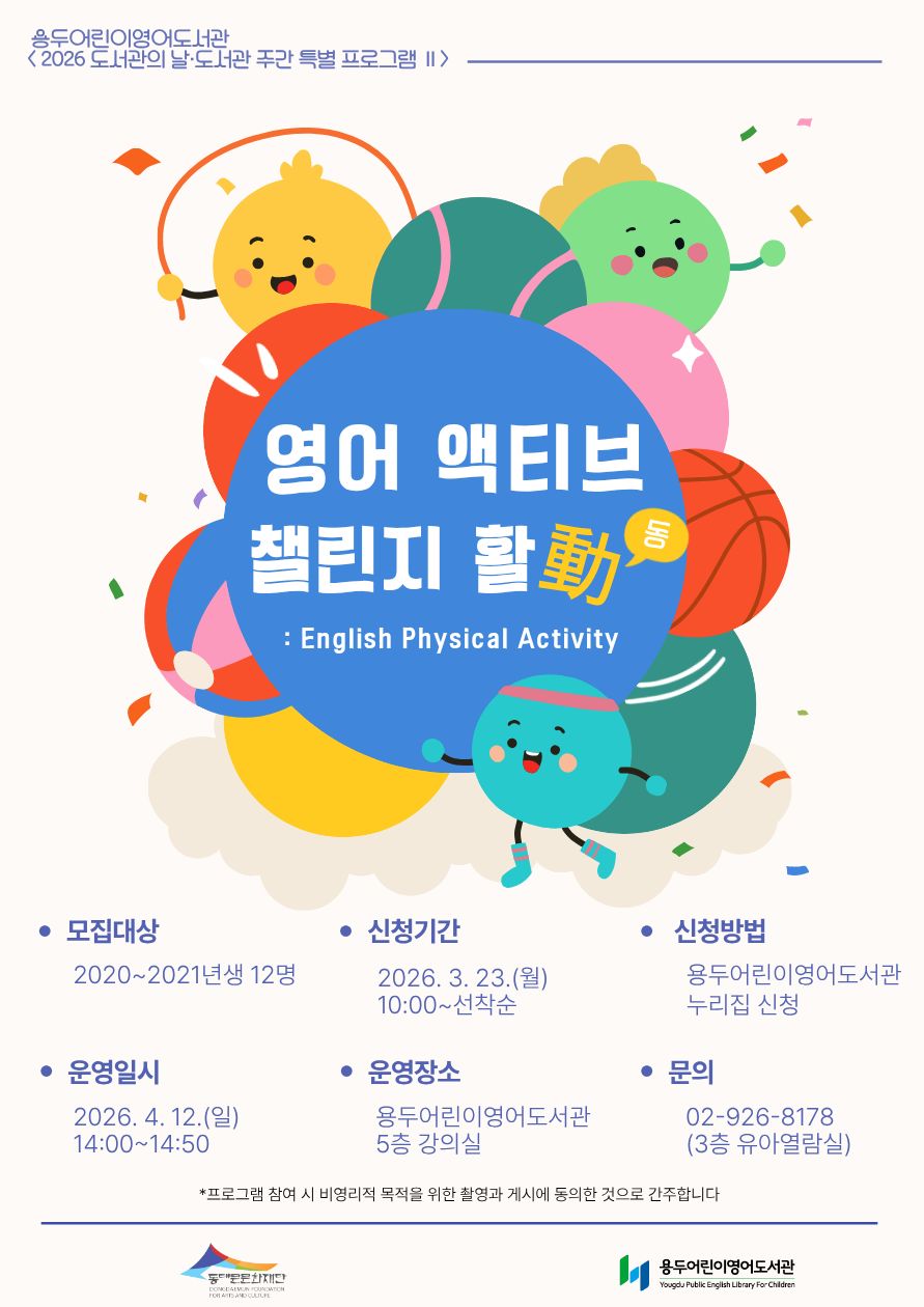 ![]() [용두어린이영어도서관] 2026년 도서관의 날·도서관 주간 행사 영어 액티브 챌린지 활動(동): English Physical Activity ■ 운영일시: 2026. 4. 12.(일) 14:00~14:50 ■ 운영장소: 용두어린이영어도서관 5층 강의실 ■ 신청대상: 2020~2021년생 어린이 12명(정회원) ■ 신청기간: 2026. 3. 23.(월) 10:00~선착순 마감 ■ 신청방법: 용두어린이영어도서관 누리집 > 문화마당 > 프로그램/행사접수 > 독서문화프로그램 ■ 관련문의: 02-926-8178 ※ 동대문구립도서관 회원카드 발급 후 참가자 본인 ID로 신청해야 합니다. ※ 도서관의 날·도서관주간 특별 프로그램은 1인 1강좌만 신청 가능합니다. (열람실 이벤트 제외) ※ 프로그램 시작 3일 전부터 당일 취소 시 다음 특별 프로그램 접수가 제한됩니다. ※ 행사 신청 시 도서관 홍보 및 결과 보고 등 비영리적 목적을 위한 촬영과 게시에 동의한 것으로 간주됩니다. |