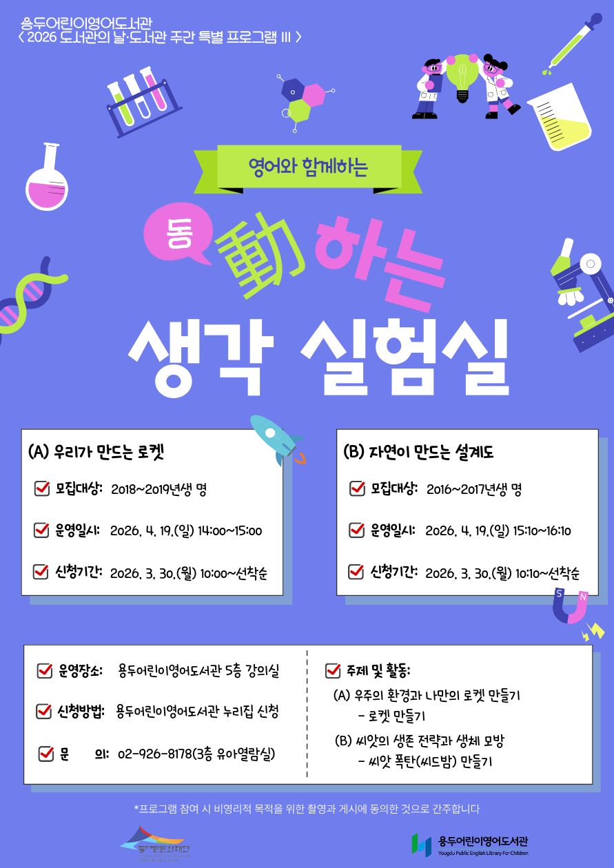 ![]() [용두어린이영어도서관] 2026년 도서관의 날·도서관 주간 행사 動(동)하는 생각 실험실(A): 우리가 만드는 로켓 ■ 운영일시: 2026. 4. 19.(일) 14:00~15:00 ■ 운영장소: 용두어린이영어도서관 5층 강의실 ■ 신청대상: 2018~2019년생 어린이 12명(정회원) ■ 신청기간: 2026. 3. 30.(월) 10:00~선착순 마감 ■ 신청방법: 용두어린이영어도서관 누리집 > 문화마당 > 프로그램/행사접수 > 독서문화프로그램 ■ 관련문의: 02-926-8178 ※ 동대문구립도서관 회원카드 발급 후 참가자 본인 ID로 신청해야 합니다. ※ 도서관의 날·도서관주간 특별 프로그램은 1인 1강좌만 신청 가능합니다. (열람실 이벤트 제외) ※ 프로그램 시작 3일 전부터 당일 취소 시 다음 특별 프로그램 접수가 제한됩니다. ※ 행사 신청 시 도서관 홍보 및 결과 보고 등 비영리적 목적을 위한 촬영과 게시에 동의한 것으로 간주됩니다. |