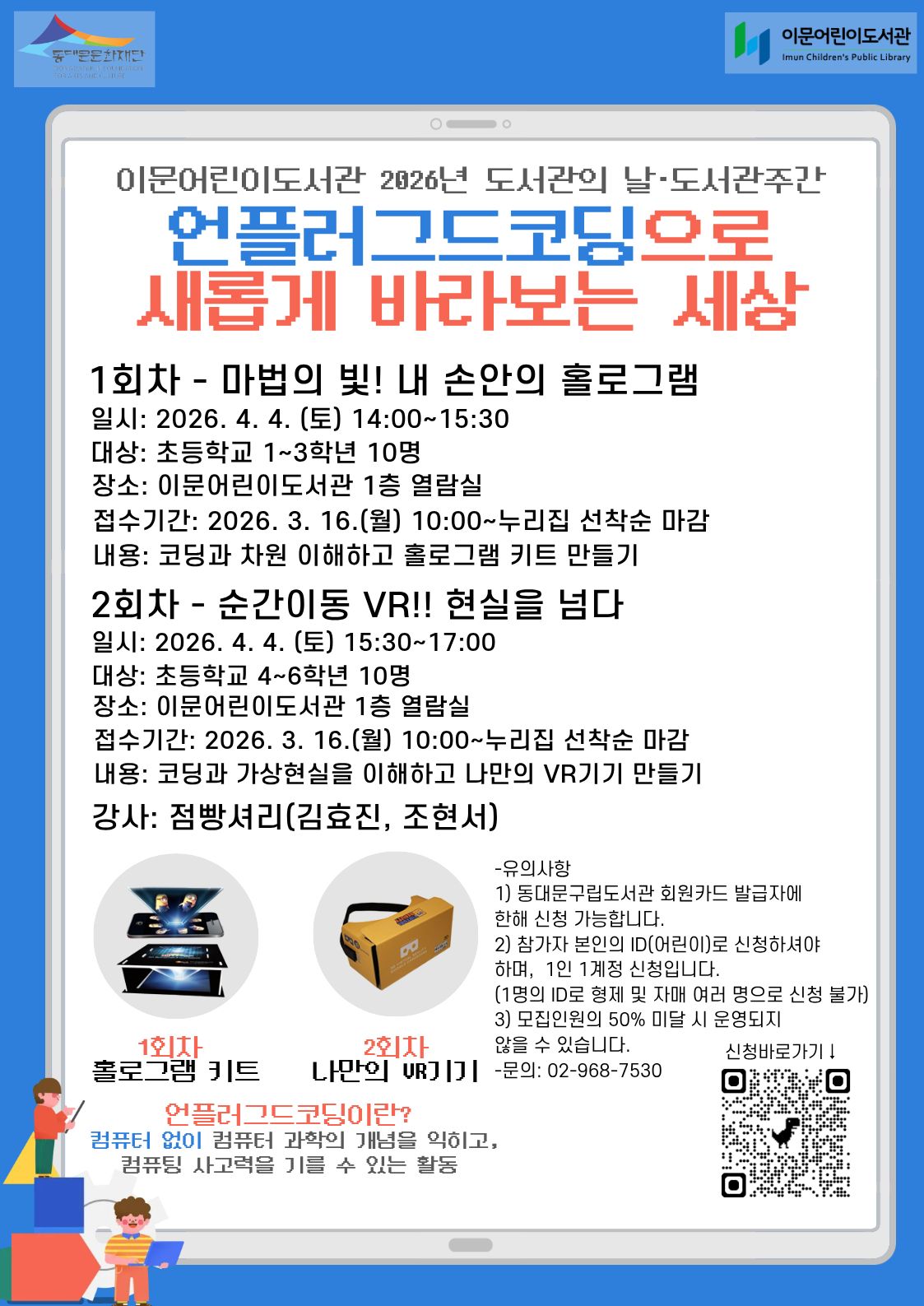 ![]() 1회차 - 마법의 빛! 내 손안의 홀로그램 일시: 2026. 4. 4. (토) 14:00~15:30 대상: 초등학교 1~3학년 10명 장소: 이문어린이도서관 1층 열람실 내용: 코딩과 차원 이해하고 홀로그램 키트 만들기 |