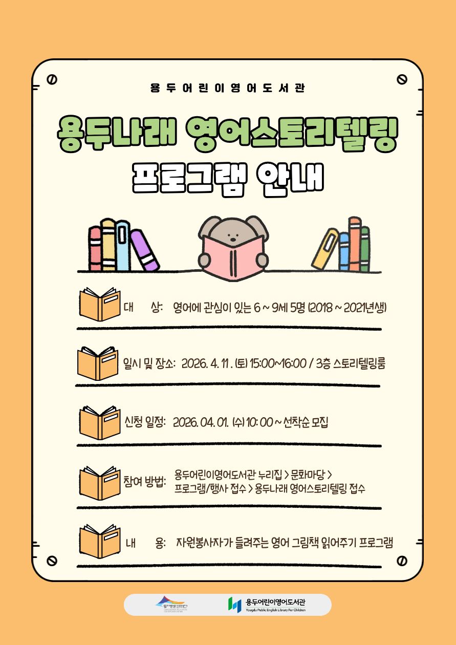 ![]() 📢[용두어린이영어도서관] 자원봉사자와 함께하는 용두나래 영어스토리텔링 운영 안내 (4월 11일) 자원봉사자의 재능나눔으로 이루어지는 수업이니 이용자 여러분의 많은 관심 부탁드립니다. 📅 수업 일정 ◾수업 일시 : 4월 11일 토요일 15:00 ~ 16:00 ◾수업 장소 : 용두어린이영어도서관 3층 스토리텔링룸 ◾내 용 : 자원봉사자와 함께하는 영어 그림책 읽기 ✅ 모집 대상 영어에 관심이 있는 2018 ~ 2021년생 5명 📋 신청 안내 ◾신청 일시 : 2026. 4. 1.(수) 10:00 (선착순 접수) ◾신청 방법 : 도서관 누리집 접수 [문화마당] > [프로그램/행사접수] > [용두나래 영어스토리텔링 접수] 💡 유의 사항 ◾본 프로그램은 아이들의 학습 향상보다는 영어의 재미를 느끼는 데 목표로 합니다. ◾자원봉사자의 사정으로 인해 수업이 취소될 수 있습니다. (취소 시 수업 전 공지 예정) ◾프로그램 참여 시 비영리적 목적을 위한 촬영과 게시에 동의한 것으로 간주합니다. 📞문의처 용두어린이영어도서관 02-926-8178 |