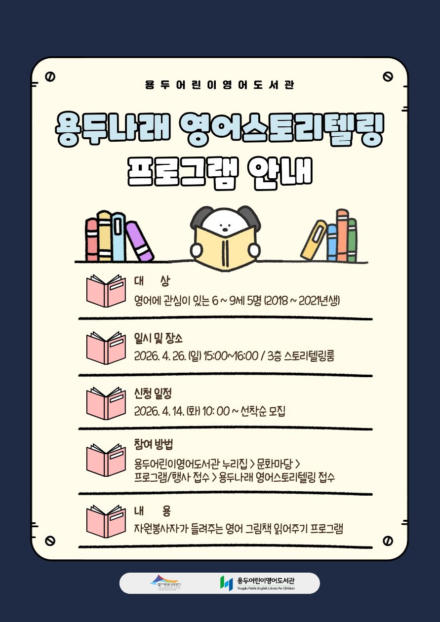안녕하세요~용두어린이영어도서관입니다^^ 자원봉사자와 함께하는 용두나래 영어스토리텔링 운영 안내입니다. 📅 수업 일정 ◾수업 일시 : 4월 26일 일요일 15:00 ~ 16:00 ◾수업 장소 : 용두어린이영어도서관 3층 스토리텔링룸 ◾내 용 : 자원봉사자와 함께하는 영어 그림책 읽기 ✅ 모집 대상 영어에 관심이 있는 6세~9세 5명(2018~2021년생) 📋 신청 안내 ◾신청 일시 : 2026. 4. 14.(화) 10:00 (선착순 접수) ◾신청 방법 : 용두어린이영어도서관 누리집 신청(https://www.l4d.or.kr/yelc) [문화마당] > [프로그램/행사접수] > [용두나래 영어스토리텔링 접수] 💡 유의 사항 ◾본 프로그램은 아이들의 학습 향상보다는 영어의 재미를 느끼는 데 목표로 합니다. ◾자원봉사자의 사정으로 인해 수업이 취소될 수 있습니다.(취소 시 수업 전 공지 예정) ◾프로그램 참여 시 비영리적 목적을 위한 촬영과 게시에 동의한 것으로 간주합니다. 📞문의처 용두어린이영어도서관 02-926-8178 #동대문문화재단 #동대문구 #용두동 #용두 #용두어린이영어도서관 #용두나래 #영어스토리텔링 #그림책 |