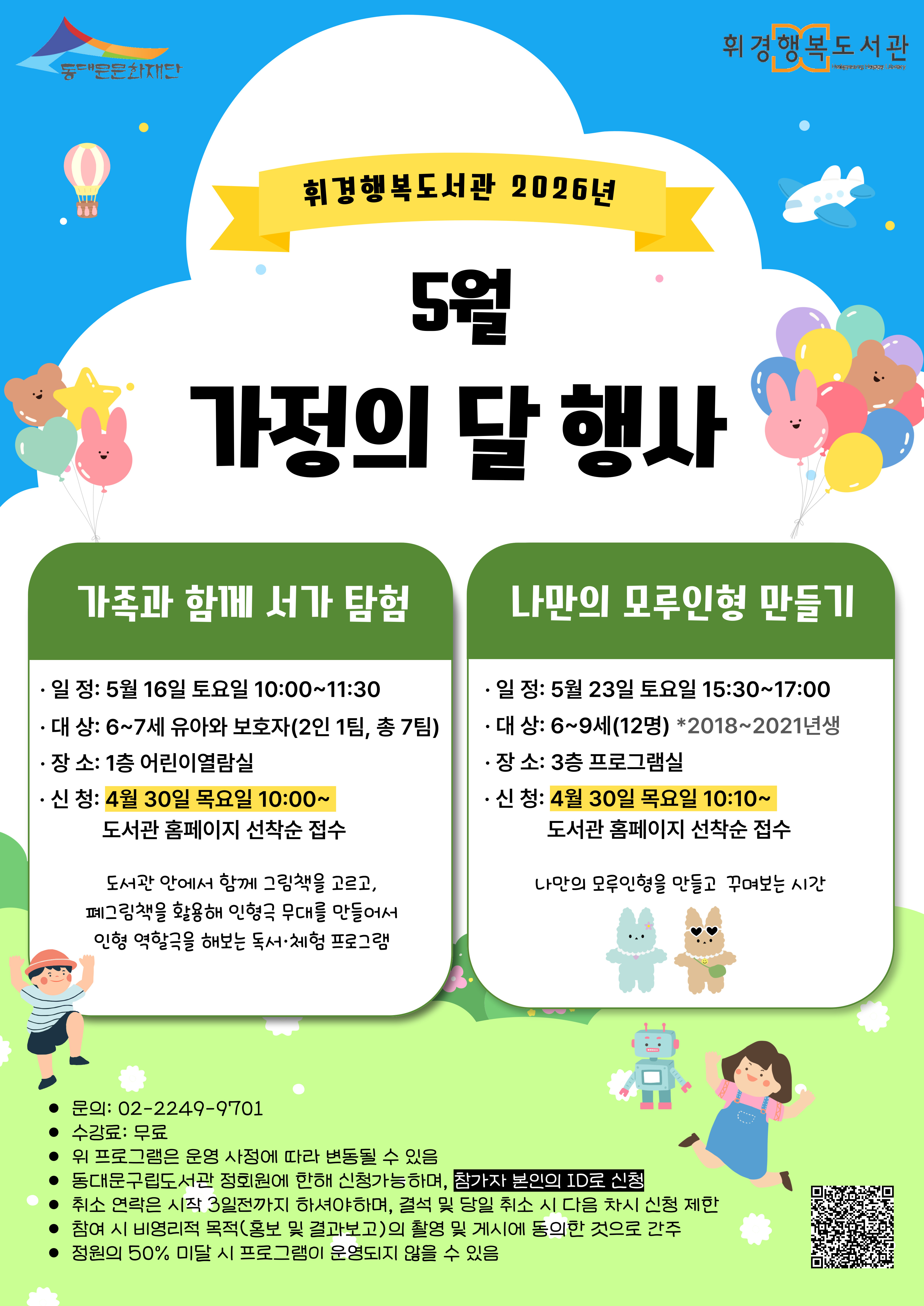 ![]() 접수: 2026. 4. 30.(목) 10:10~ 선착순 대상: 6~9세 아동 총 12명 (2026년 기준 나이) ★ 연락 받으실 수 있는 전화번호를 정확하게 입력해주세요. → 전화번호 기재 오류로 인해 연락이 어려우면 대기자에게 순번이 돌아갑니다. ★ 프로그램 시작 3일 전까지만 취소 가능하며 도서관으로 연락 필수 → 당일 결석시 다음 프로그램 신청이 제한될 수 있습니다. ![]()