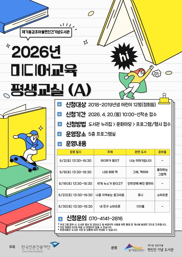 ![]() [제기동감초마을현진건기념도서관] 2026년 미디어교육 평생교실(A) 📍신청대상: 2018~2019년생 어린이 12명(정회원) 📍신청기간: 2026. 4. 20.(월) 10:00~선착순 접수 📍신청방법: 도서관 누리집 > 문화마당 > 프로그램/행사 접수 📍운영장소: 5층 프로그램실 📍운영내용