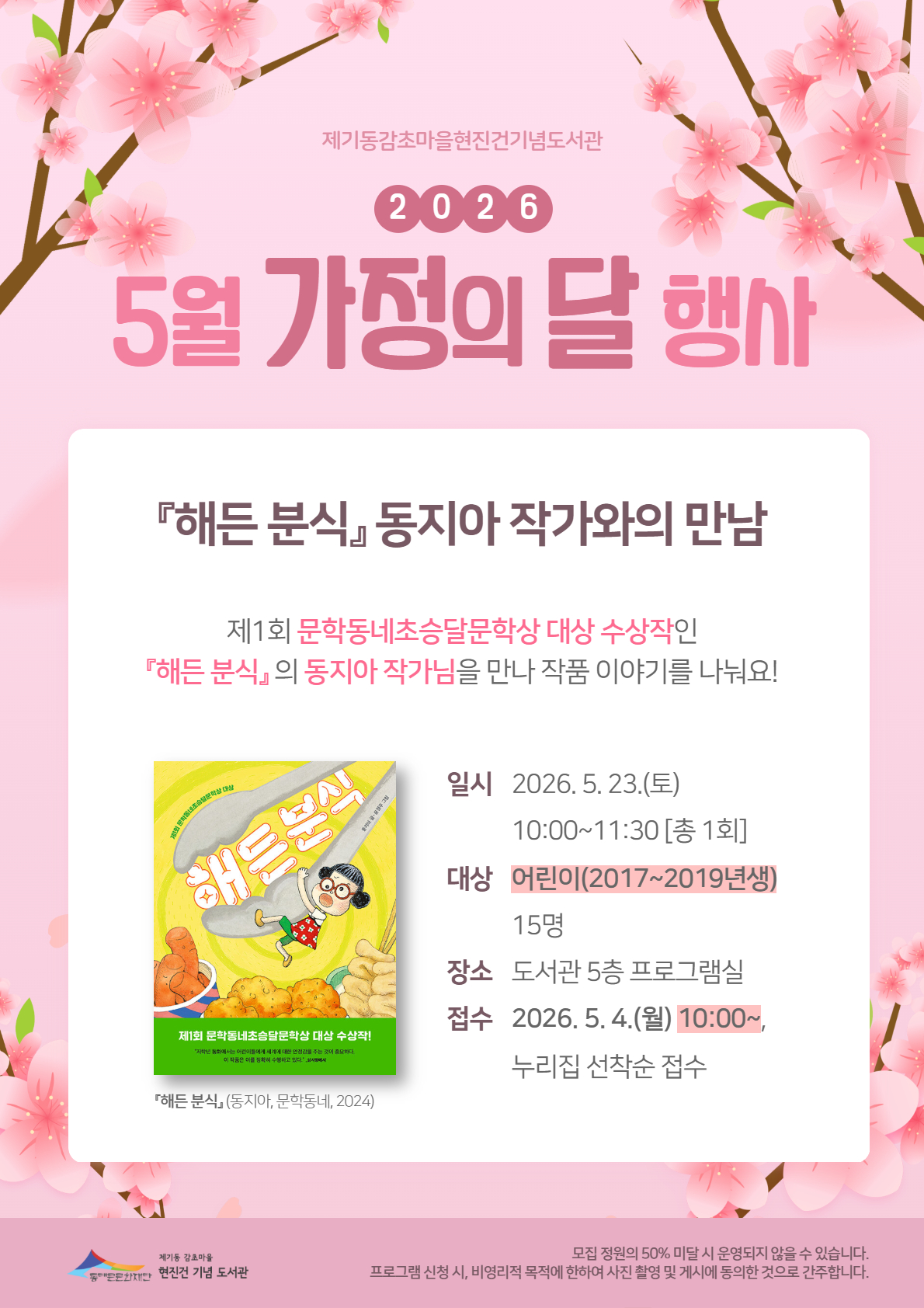[제기동감초마을현진건기념도서관] 2026년 5월 가정의 달 행사 :『해든 분식』동지아 작가와의 만남 ♦ 일 시: 2026. 5. 23.(토) 10시~11시 30분 ♦ 대 상: 어린이(2017~2019년생) 15명 ♦ 장 소: 제기동감초마을현진건기념도서관 5층 프로그램실 ♦ 진 행: 동지아 작가님 -『해든 분식』(문학동네, 2024) (제1회 문학동네초승달 문학상 수상) -『이건 진짜 비밀인데!』(길벗어린이, 2025) -『해든 버거』(문학동네, 2026) ♦ 내 용 -『해든 분식』의 탄생 배경과 집필 계기 소개 - 내용 되짚기 및 독서 퀴즈 - 책이 만들어지기까지의 과정 알아보기 -『해든 분식』세계관의 다음 이야기 공유 등 ♦ 신 청: 2026. 5. 4.(월) 오전 10시부터 도서관 홈페이지 선착순 접수 ♦ 문 의: 02-928-3141 <프로그램 신청 전 확인 사항> • 수강자(2017~2019년생 어린이) 아이디로만 접수 가능합니다. • 모집정원의 50% 미달 시 운영되지 않을 수 있습니다. • 프로그램 신청 시, 비영리적 목적에 한하여 사진 촬영 및 게시에 동의한 것으로 간주합니다. |