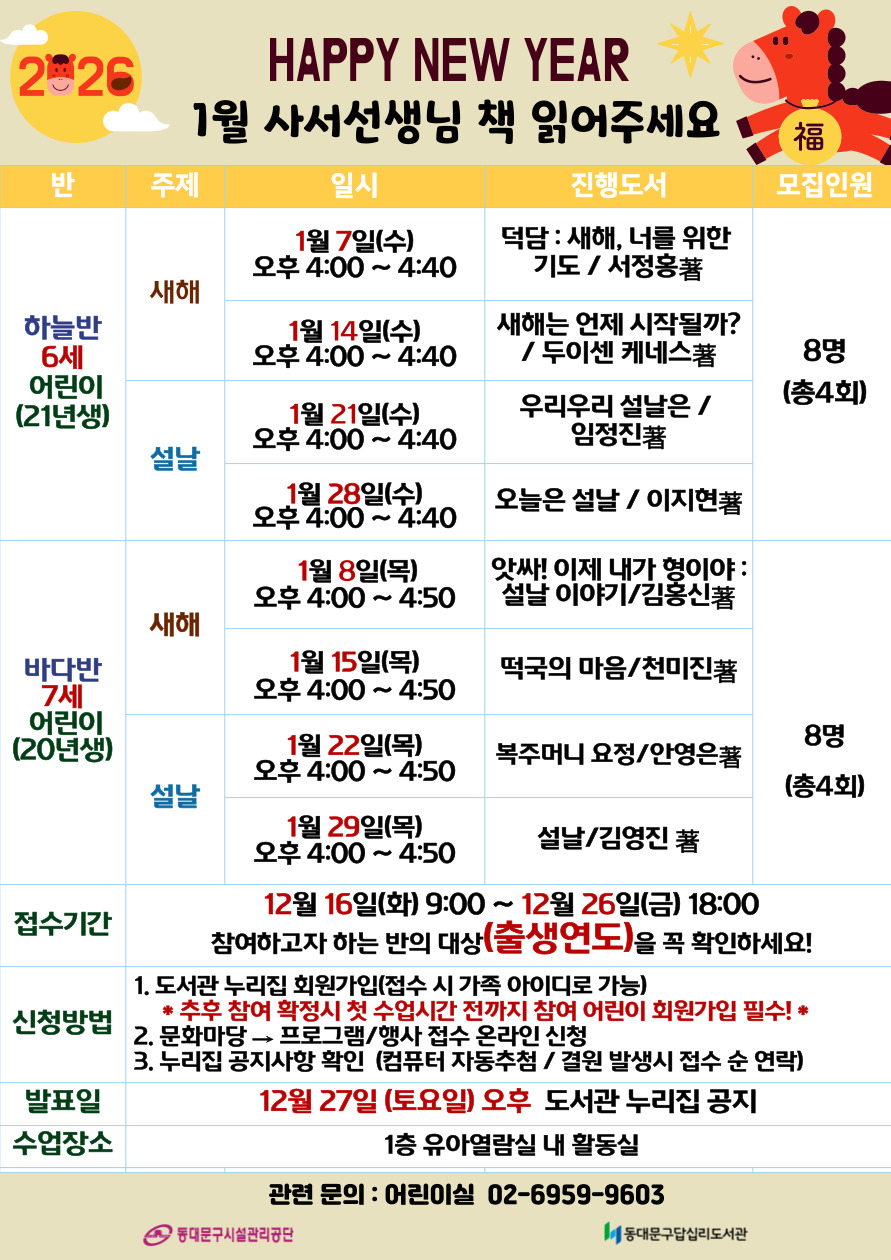 ![]() ※ 접수는 선착순이 아닌 추첨으로 진행됩니다 * 가족아이디로 대리 신청가능합니다. (신청시 참여어린이 연령 확인 꼭) * 추후 참여 확정 시 첫 수업 전까지 참여 어린이 회원 가입 필수! * 참여 어린이 사진 촬영을 할 예정이오니 촬영에 동의하시는 분만 신청 바랍니다. |