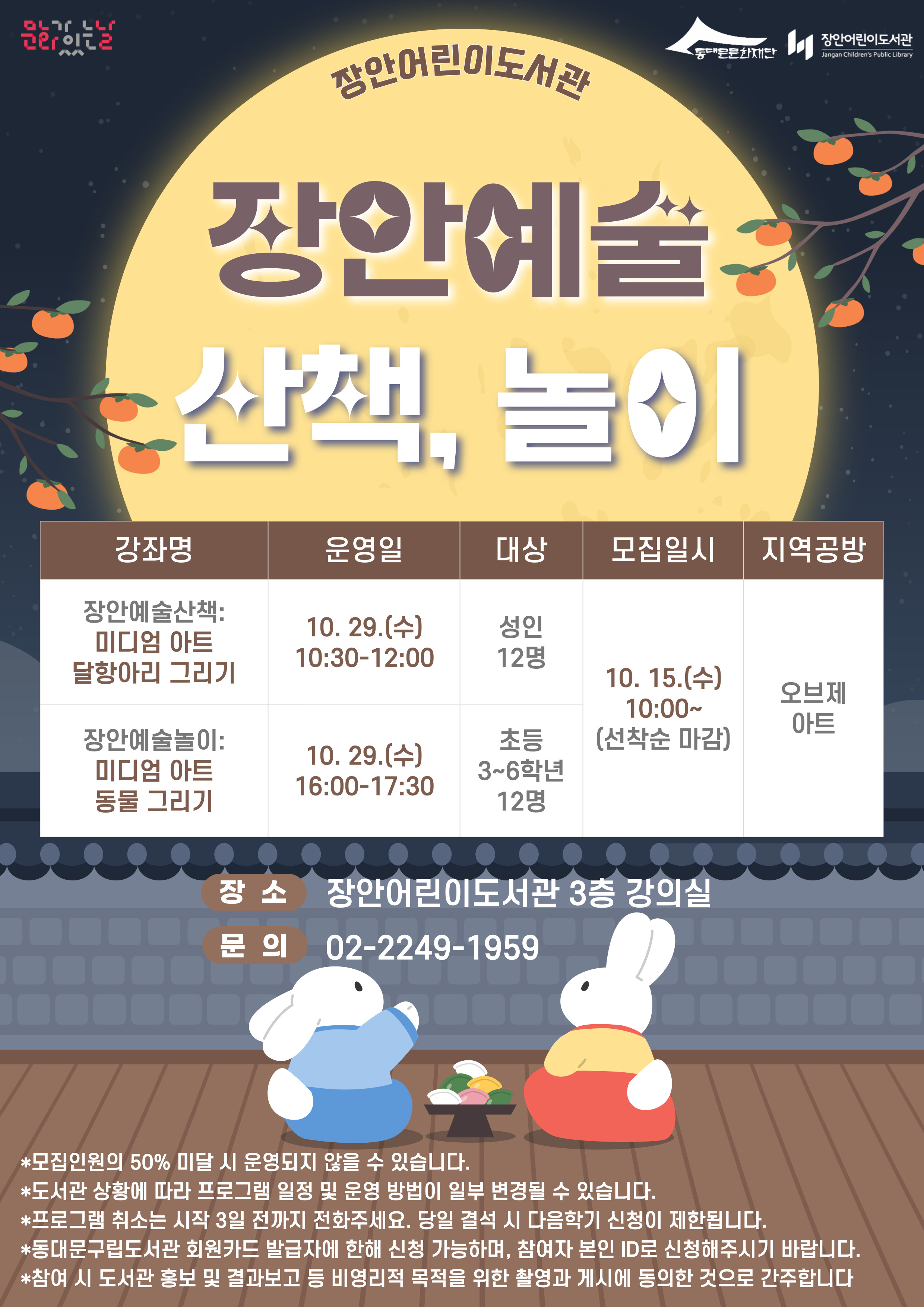 ▶접수 페이지 바로가기![]() [10월 문화가 있는 날] 장안 예술 프로그램 <장안 예술 산책 - 미디엄 아트 달항아리 그리기> -운영 일시: 2025년 10월 29일(수) 10:30~12:00 -모집 대상: 성인 12명 -모집 일시: 2025년 10월 15일(수) 10:00~ 선착순 마감 -운영 장소: 장안어린이도서관 3층 강의실 <장안 예술 놀이- 미디엄 아트 동물 그리기> -운영 일시: 2025년 10월 29일(수) 16:00~17:30 -모집 대상: 초등 3~6학년 12명 -모집 일시: 2025년 10월 15일(수) 10:00~ 선착순 마감 -운영 장소: 장안어린이도서관 3층 강의실 참가비는 무료이며, 이용자 여러분의 많은 참여 바랍니다! ※ 상세 수업계획은 수업 계획안을 참조하시기 바랍니다. ※ 도서관 상황에 따라 운영 일정 및 방법이 일부 변경될 수 있습니다. ※ 동대문구립도서관 회원카드 발급 후 참가자 본인 ID로 신청해야 합니다. ※ 모든 수업 공지 및 알림은 문자로 전송됩니다. 반드시 현재 사용 가능한 휴대폰 번호로 접수해 주시기 바랍니다. ※ 프로그램 취소는 시작 3일 전까지 도서관으로 전화 주세요. 당일 취소, 결석 시 다음 강의 접수가 제한됩니다. ※ 프로그램 참여 시 도서관 홍보 및 결과 보고 등 비영리적 목적을 위한 촬영과 게시에 동의한 것으로 간주됩니다. |