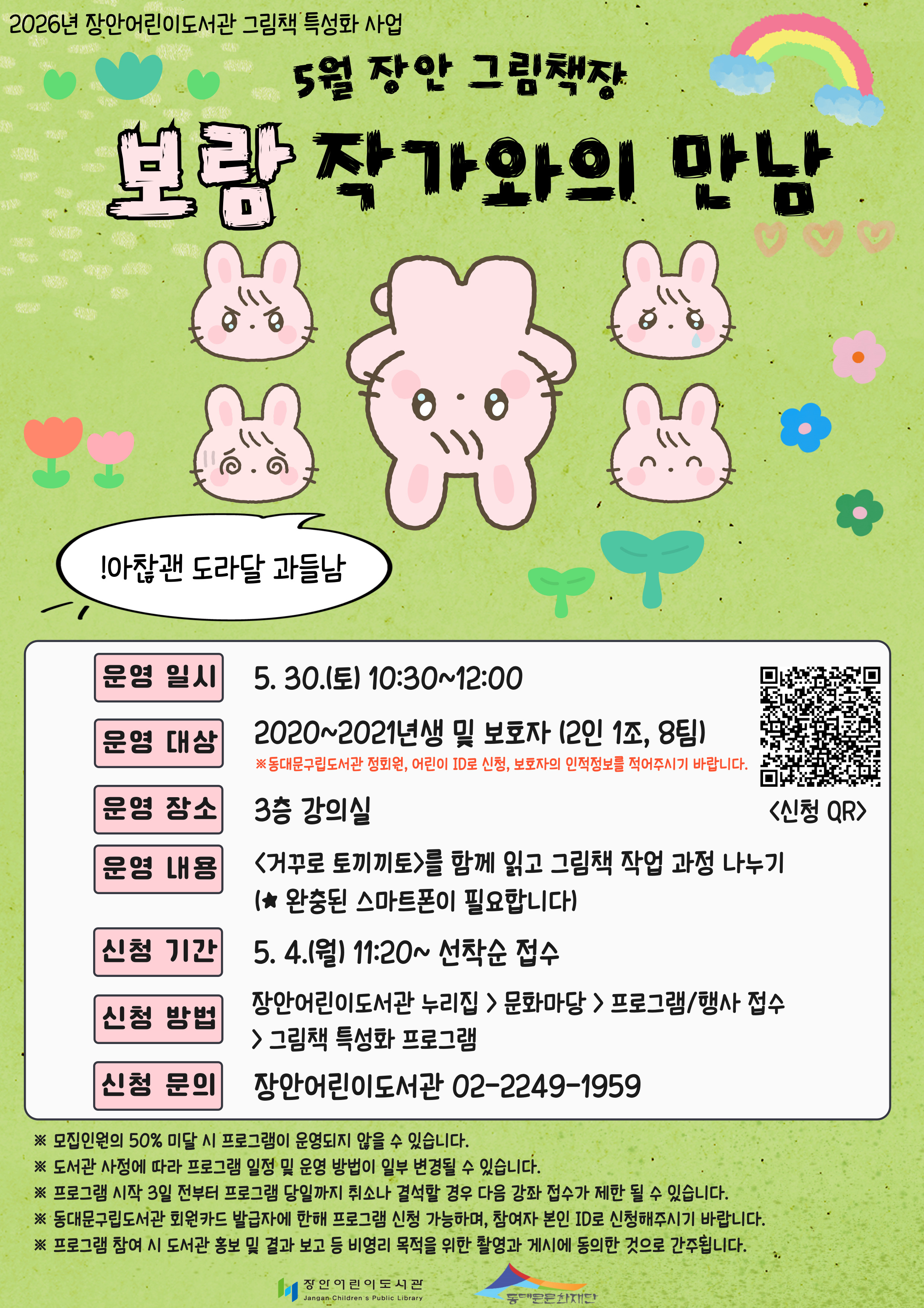 ![]() 2026년 장안어린이도서관 그림책 특성화 사업 5월 장안 그림책장 보람 작가와의 만남→신청 바로가기 !아찮괜 도라달 과들남 🐰운영 일시 5. 30.(토) 10:30~12:00 🐰운영 대상 2020~2021년생 및 보호자 (2인 1조, 8팀) 동대문구립도서과 정회원, 어린이 ID로 신청, 보호자의 인적정보를 적어주시기 바랍니다. 🐰운영 장소 3층 강의실 🐰운영 내용 <거꾸로 토끼끼토>를 함께 읽고 그림책 작업 과정 나누기(완충된 스마트폰이 필요합니다) 🐰신청 기간 5. 4.(월) 11:20~ 선착순 접수 🐰신청 방법 장안어린이도서관 누리집 > 문화마당> 프로그램/행사 접수> 그림책 특성화 프로그램 <참고사항> ※ 모집인원의 50% 미달 시 프로그램이 운영되지 않을 수 있습니다. ※ 도서관 사정에 따라 프로그램 일정 및 운영 방법이 일부 변경될 수 있습니다. ※ 프로그램 시작 3일 전부터 프로그램 당일까지 취소나 결석할 경우 다음 강좌 접수가 제한 될 수 있습니다. ※ 동대문구립도서관 회원카드 발급자에 한해 프로그램 신청 가능하며, 참여자 본인 ID로 신청해주시기 바랍니다. ※ 프로그램 참여 시 도서관 홍보 및 결과 보고 등 비영리 목적을 위한 촬영과 게시에 동의한 것으로 간주됩니다. 신청 문의 02-2249-1959 |
