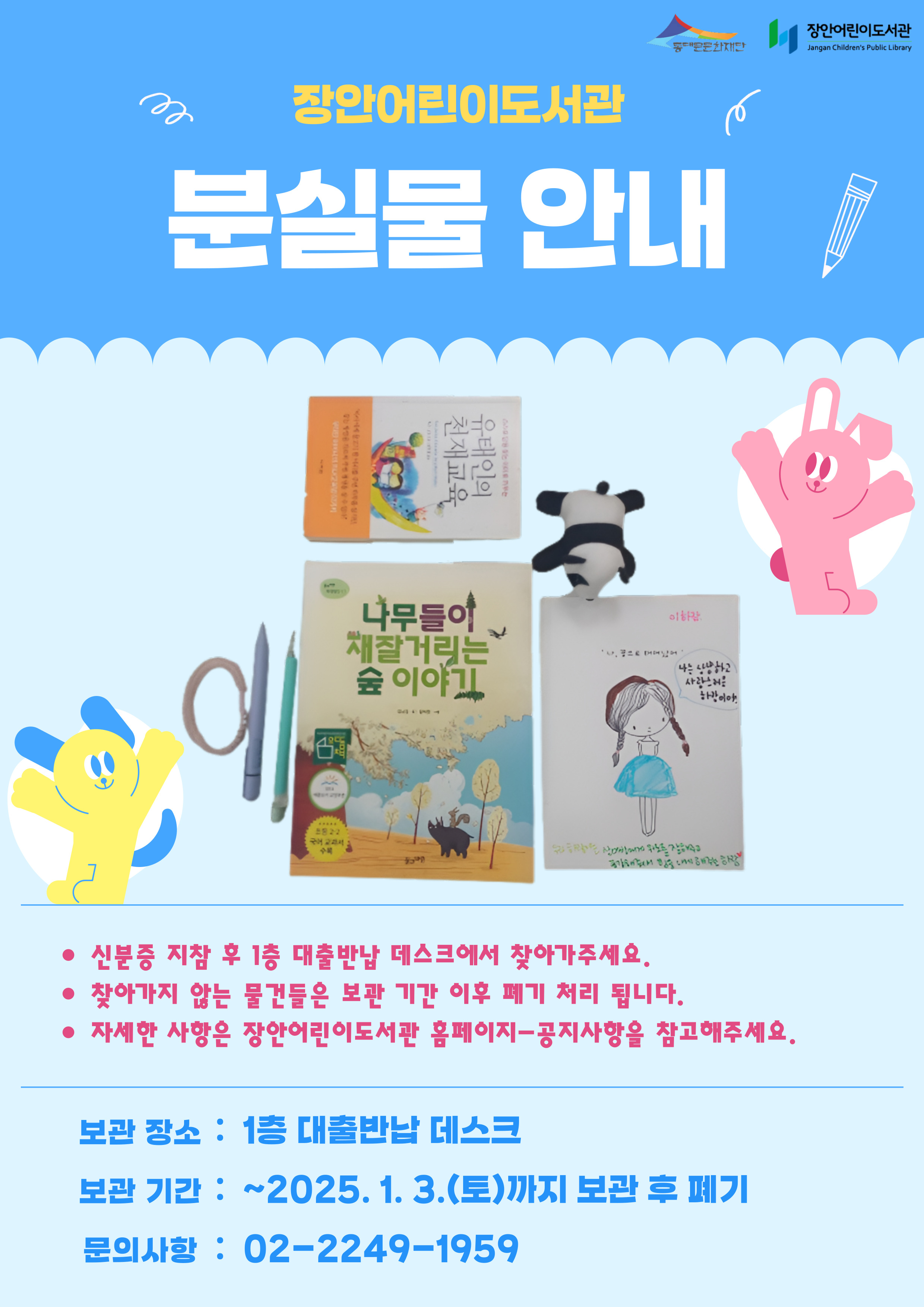 | 제목 | [장안어린이도서관] 분실물 안내(보관기간~2025. 1. 3.)(총7건) |