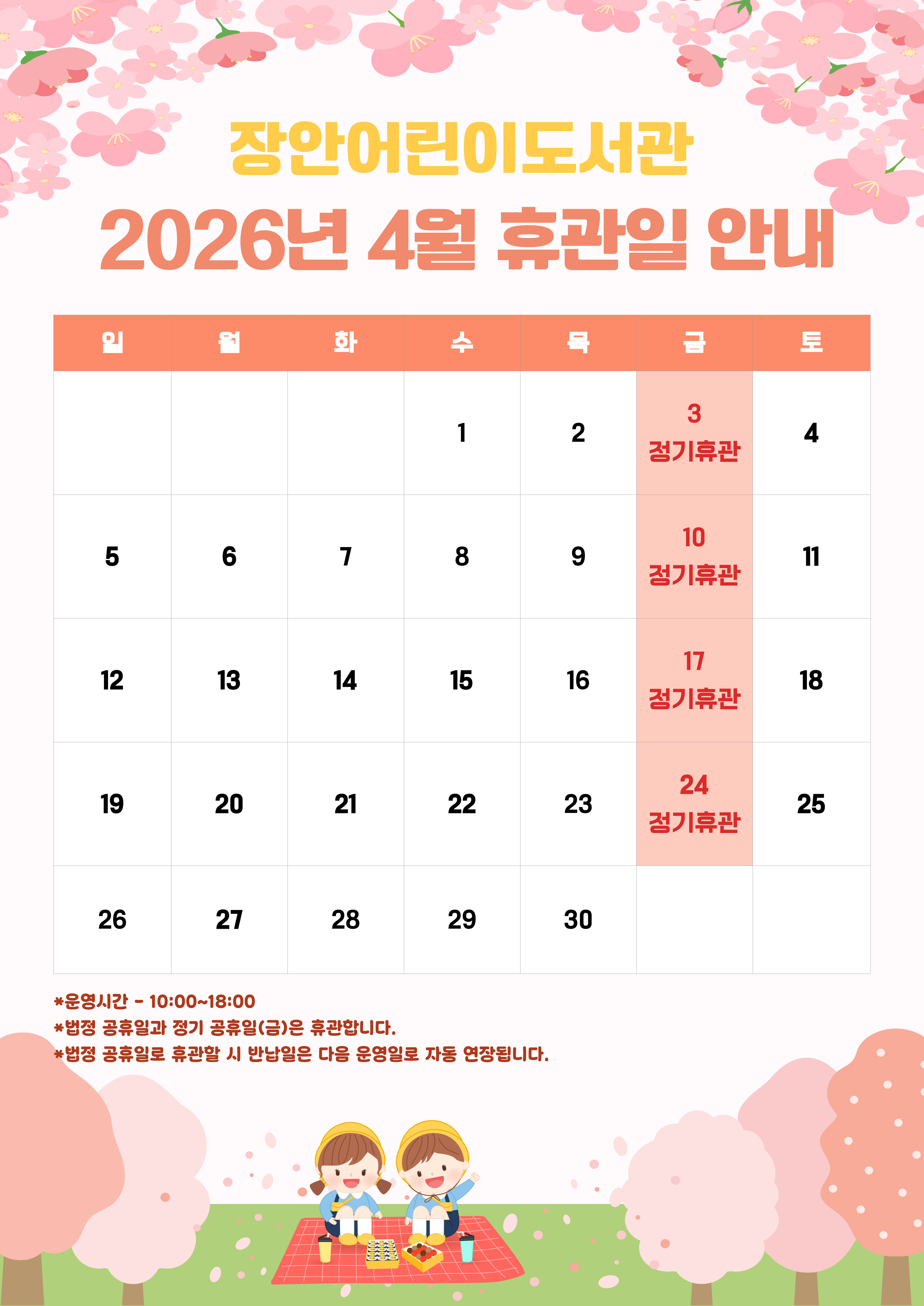 [장안어린이도서관] 2026년 4월 휴관일 안내