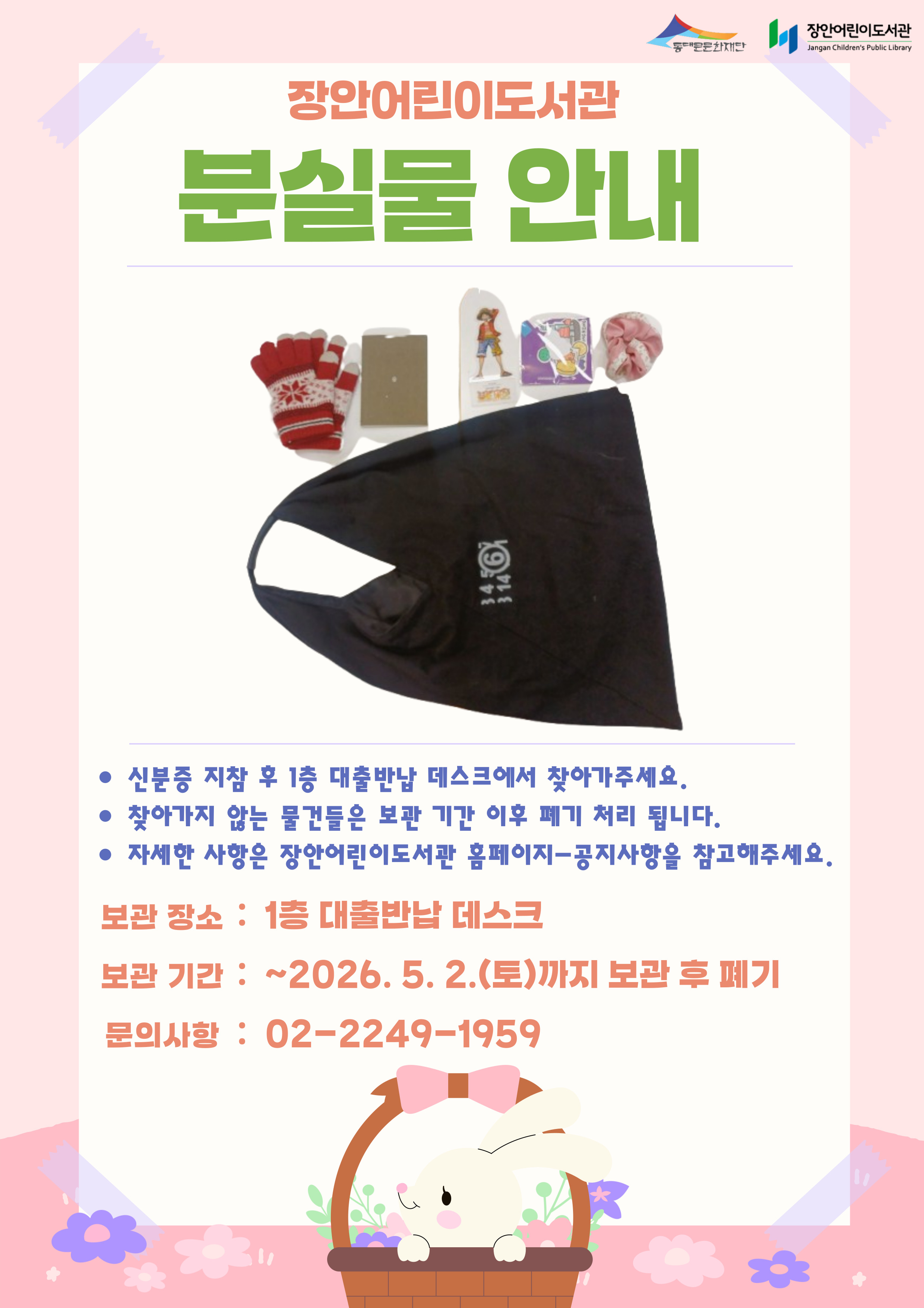 [장안어린이도서관] 분실물 안내(보관기간~2026. 5. 2.)(총6건)