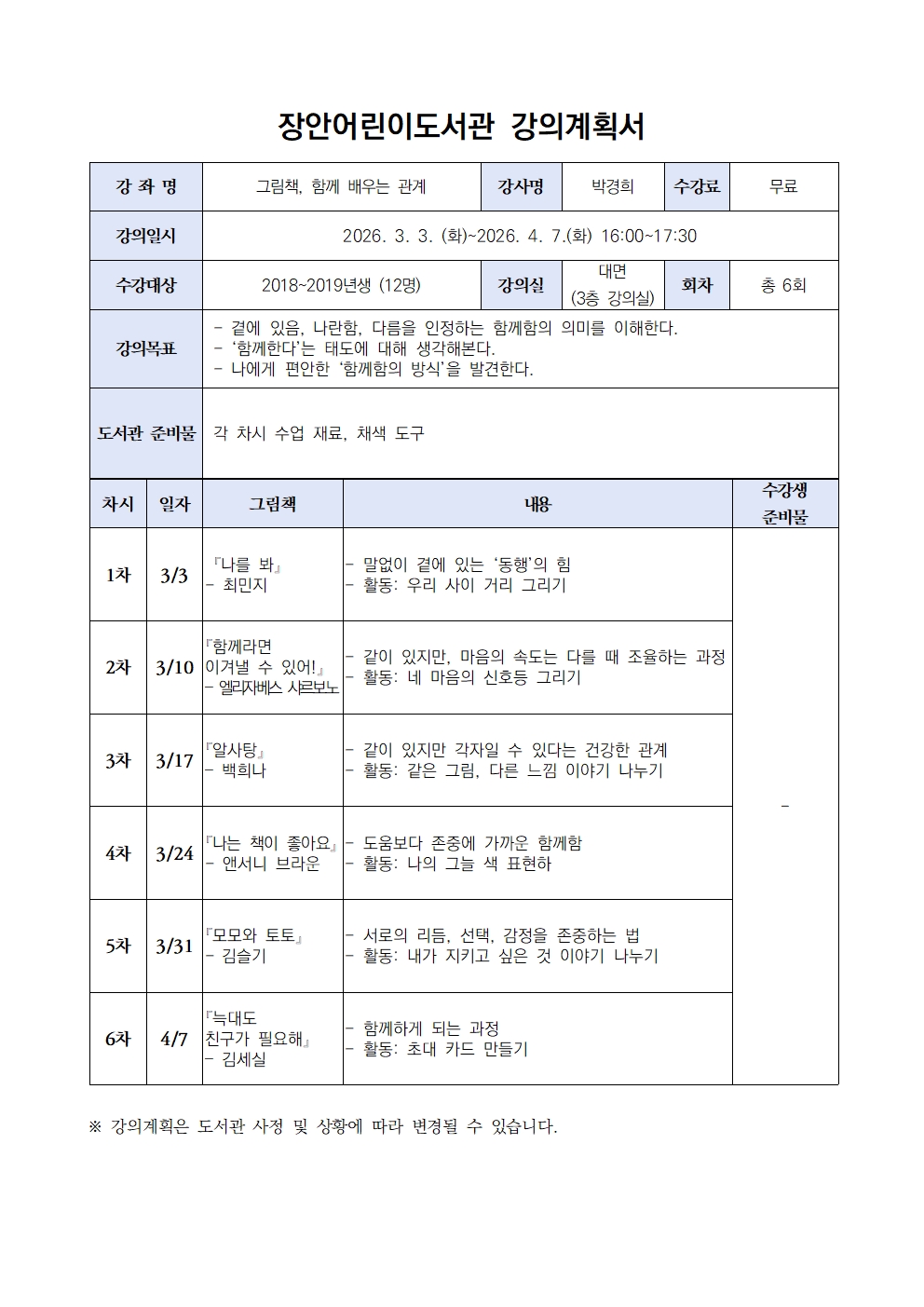 | 강좌장소 | 장안어린이도서관 3층 강의실 |
