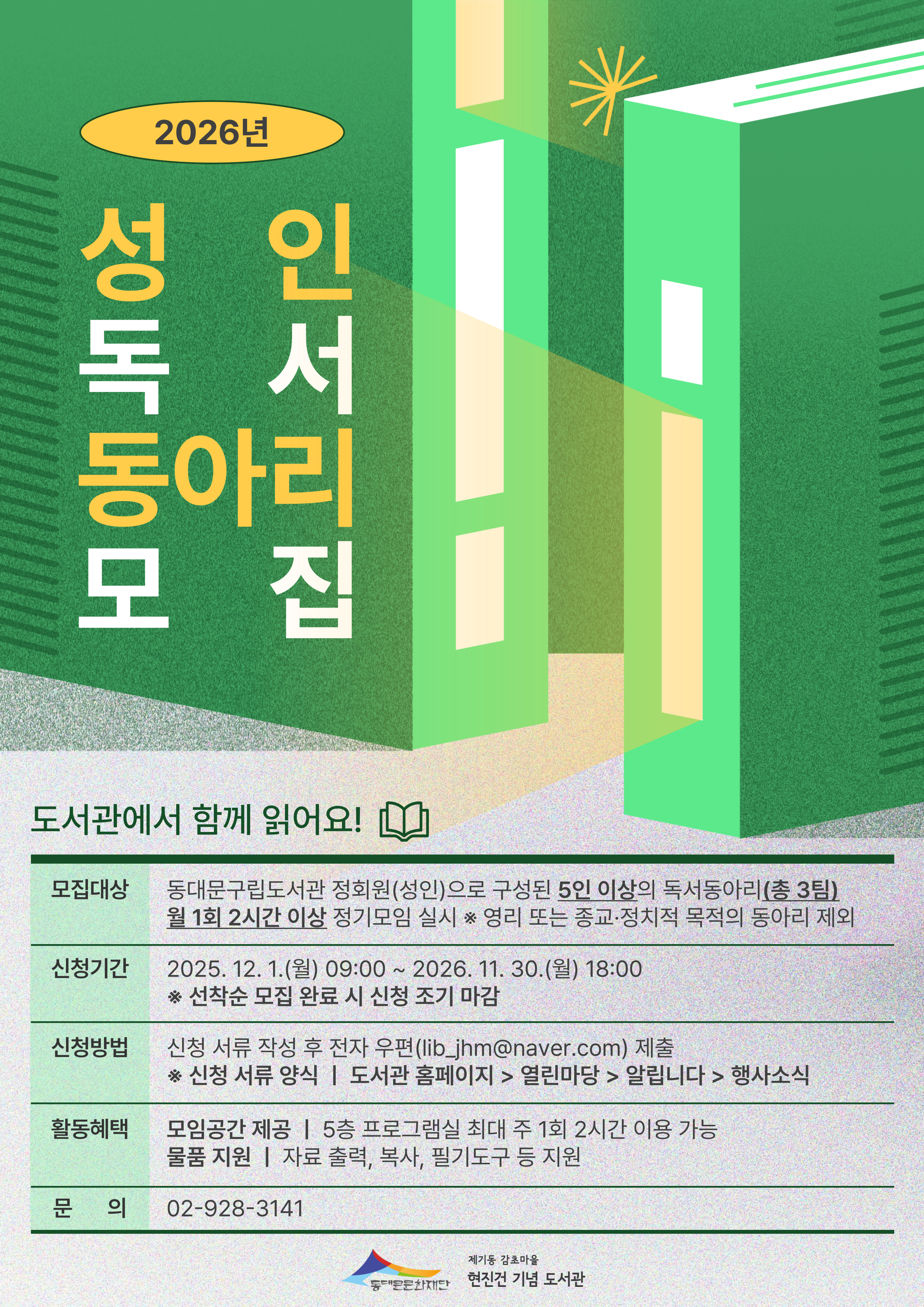 ![]() [제기동 감초마을 현진건 기념 도서관] 2026년 성인 독서동아리 모집 📚 제기동감초마을현진건기념도서관에서 활동할 성인 독서동아리를 모집합니다. 독서동아리 운영에 필요한 모임공간 및 물품을 지원할 예정이오니 많은 신청 바랍니다. 📍모집대상 : 동대문구립도서관 정회원(성인)으로 구성된 5인 이상의 독서동아리(총 3팀) ※ 월 1회 2시간 이상 정기모임 실시 ※ 영리 또는 종교·정치적 목적의 동아리 제외 📍신청기간 : 2025. 12. 1.(월) 09:00 ~ 2026. 11. 30.(월) 18:00 ※ 선착순 모집 완료 시 신청 조기 마감 📍신청방법 : 신청 서류 작성 후 전자 우편(lib_jhm@naver.com) 제출 ※ 신청 서류 양식 : 도서관 홈페이지 > 열린마당 > 알립니다 > 행사소식 > [행사] 2026년 성인 독서동아리 모집 > 첨부파일 ※ 신청서에 희망 모임 주기를 작성하여 제출해주시면 도서관 담당자와 협의 후 프로그램실 사용 가능 시간대에 모임 일정을 최종 확정 지을 수 있는 점 참고 부탁드립니다. 🎁활동혜택🎁 1. 모임공간 제공 : 5층 프로그램실 최대 주 1회 2시간 이용 가능 2. 물품 지원 : 자료 출력, 복사, 필기도구 등 지원 📞문의 : 02-928-3141 |